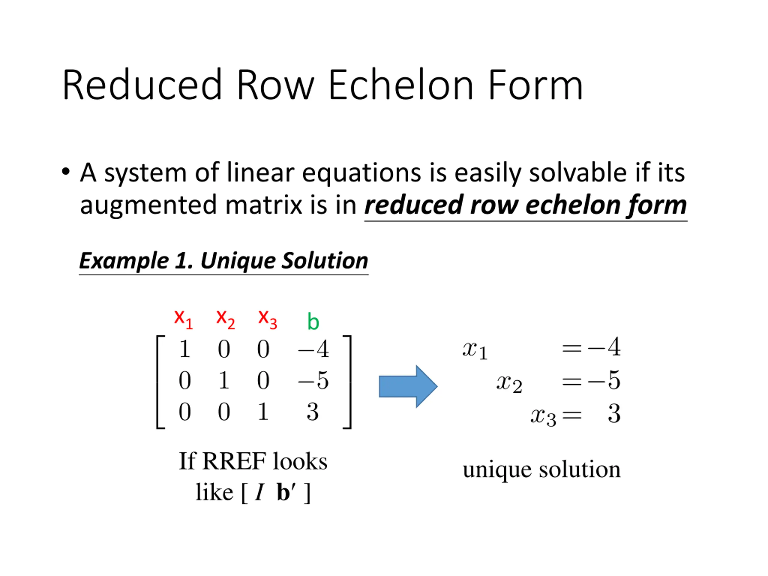 Reduced Row Echelon Form A system of linear equations is easily solvable if its augmented matrix is in reduced row echelon form Example 1. Unique Solution x1 x2 x3 b If RREF looks like [ I b ] unique solution