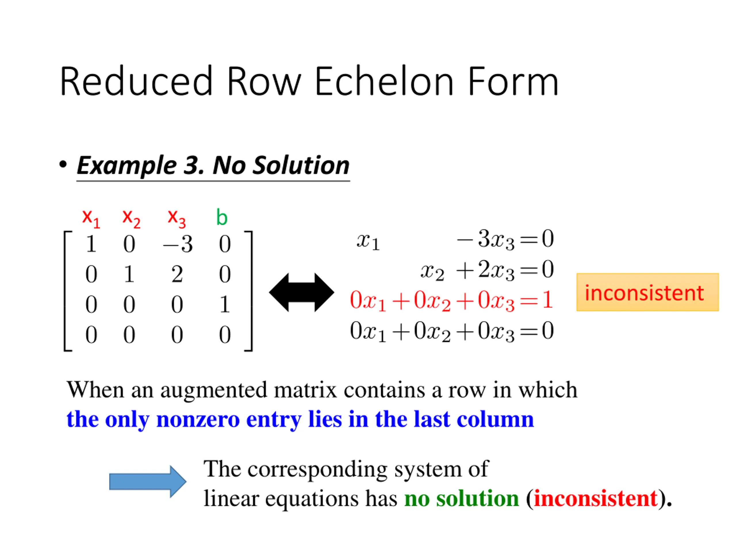 Reduced Row Echelon Form Example 3. No Solution x1 x2 x3 b inconsistent When an augmented matrix contains a row in which the only nonzero entry lies in the last column The corresponding system of linear equations has no solution (inconsistent).