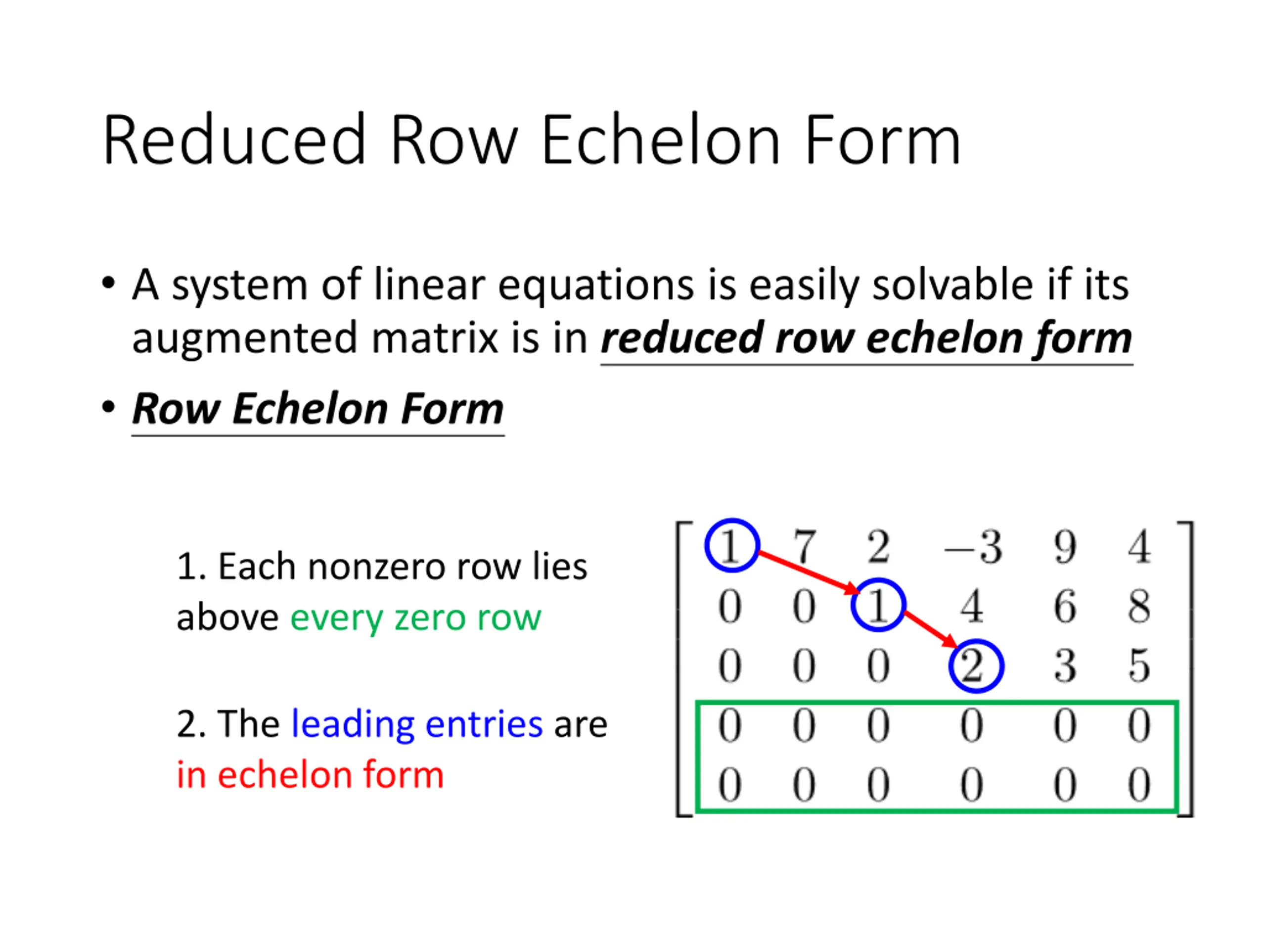 Reduced Row Echelon Form A system of linear equations is easily solvable if its augmented matrix is in reduced row echelon form Row Echelon Form 1. Each nonzero row lies above every zero row 2. The leading entries are in echelon form