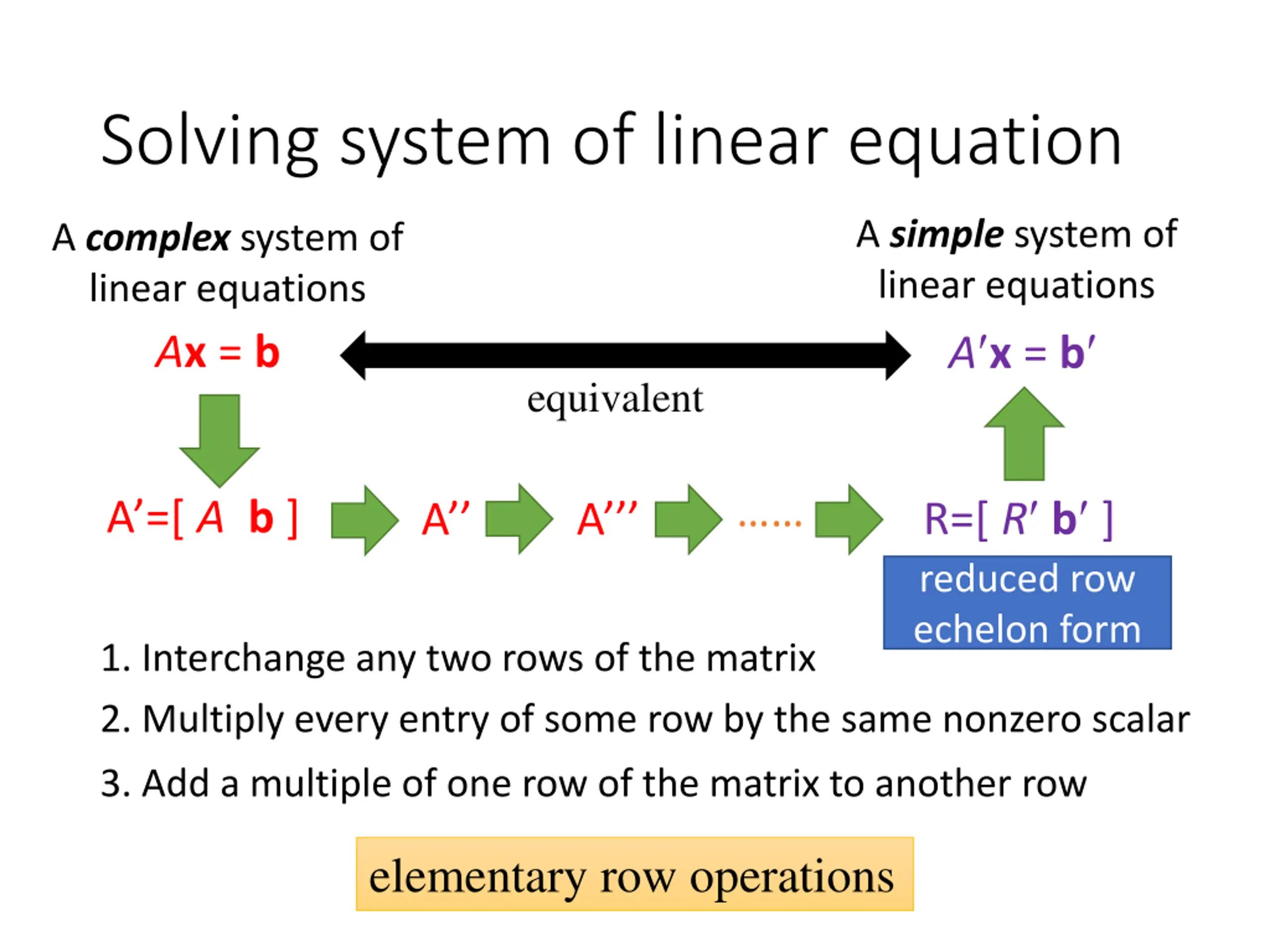 Solving system of linear equation A simple system of linear equations A complex system of linear equations A x = b Ax = b equivalent R=[ R b ] reduced row echelon form A =[ A b ] A A 1. Interchange any two rows of the matrix 2. Multiply every entry of some row by the same nonzero scalar 3. Add a multiple of one row of the matrix to another row elementary row operations