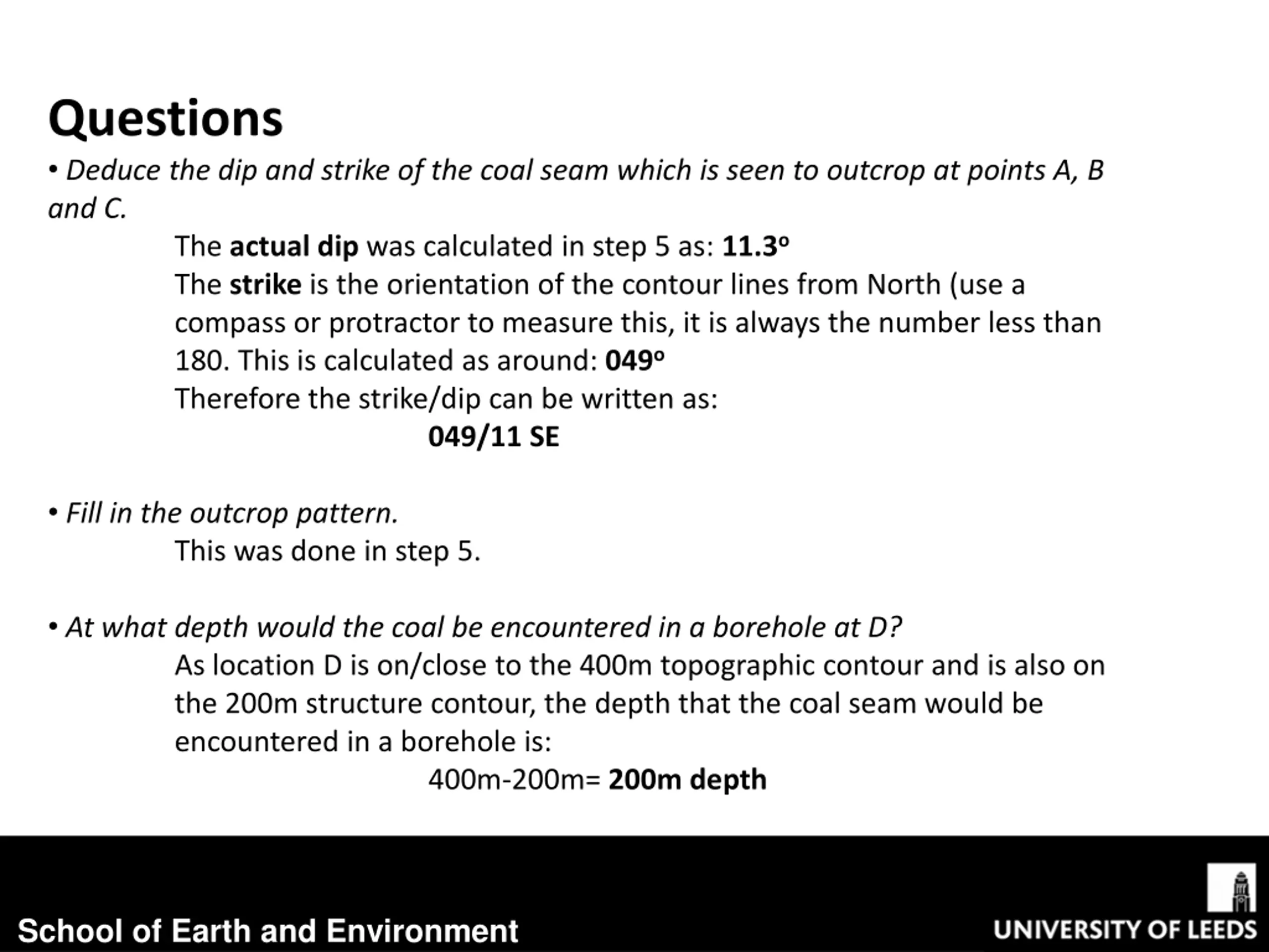 Questions Deduce the dip and strike of the coal seam which is seen to outcrop at points A, B and C. The actual dip was calculated in step 5 as: 11.3o The strike is the orientation of the contour lines from North (use a compass or protractor to measure this, it is always the number less than 180. This is calculated as around: 049o Therefore the strike/dip can be written as: 049/11 SE Fill in the outcrop pattern. This was done in step 5. At what depth would the coal be encountered in a borehole at D? As location D is on/close to the 400m topographic contour and is also on the 200m structure contour, the depth that the coal seam would be encountered in a borehole is: 400m-200m= 200m depth School of Earth and Environment
