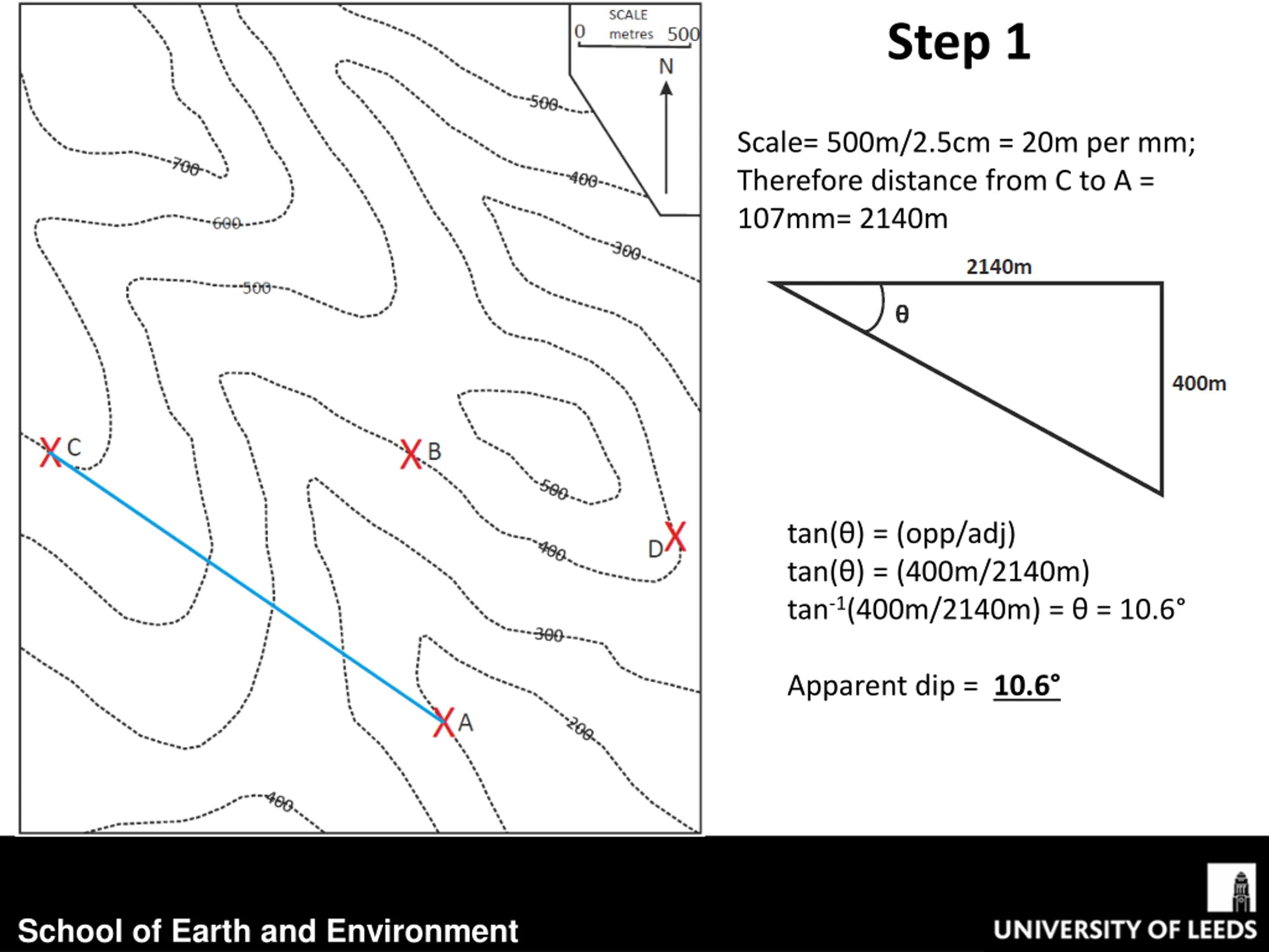 Step 1 Scale= 500m/2.5cm = 20m per mm; Therefore distance from C to A = 107mm= 2140m tan( ) = (opp/adj) tan( ) = (400m/2140m) tan-1(400m/2140m) = = 10.6 Apparent dip = 10.6 School of Earth and Environment