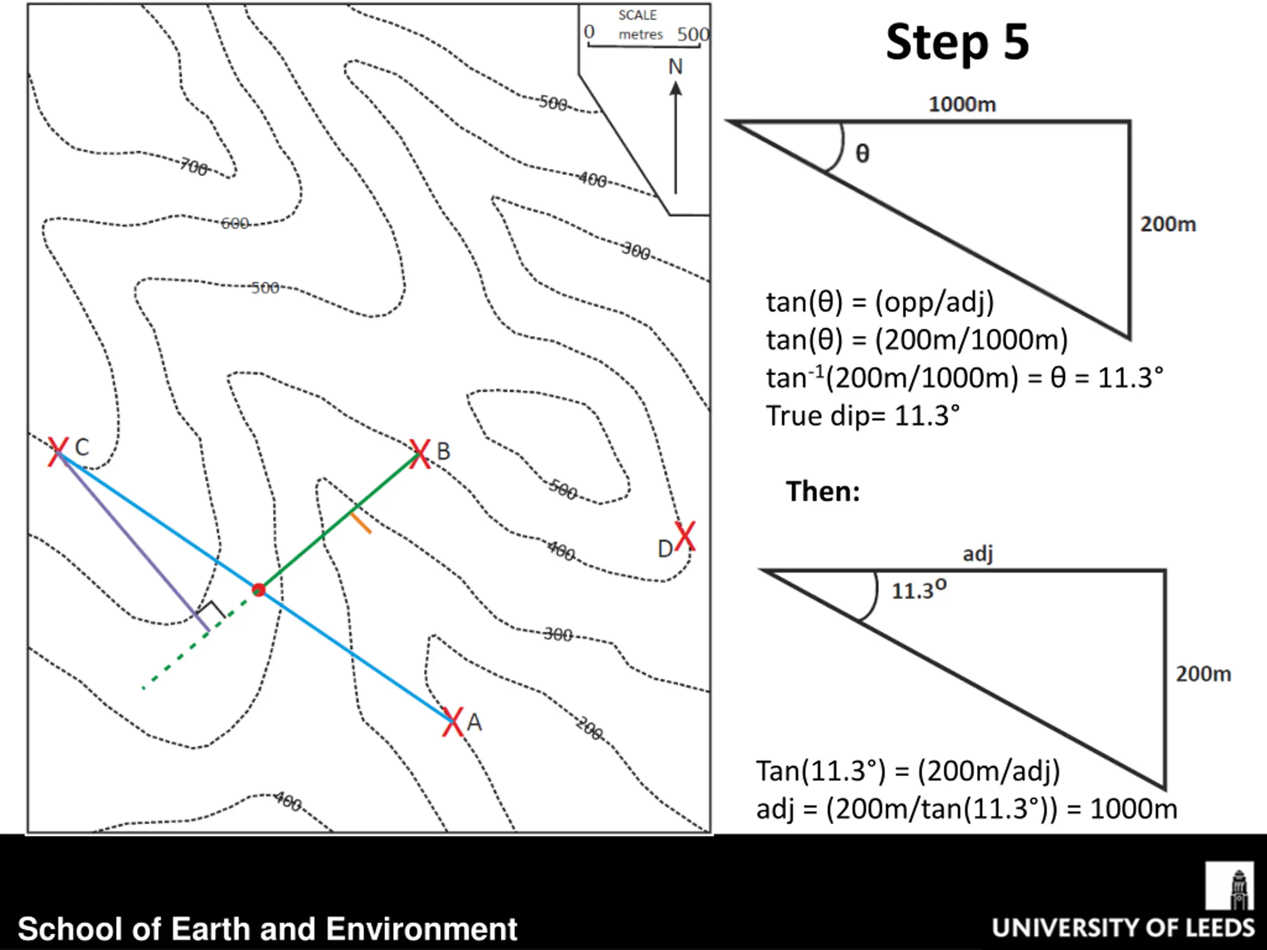 Step 5 tan( ) = (opp/adj) tan( ) = (200m/1000m) tan-1(200m/1000m) = = 11.3 True dip= 11.3 Then: Tan(11.3 ) = (200m/adj) adj = (200m/tan(11.3 )) = 1000m School of Earth and Environment