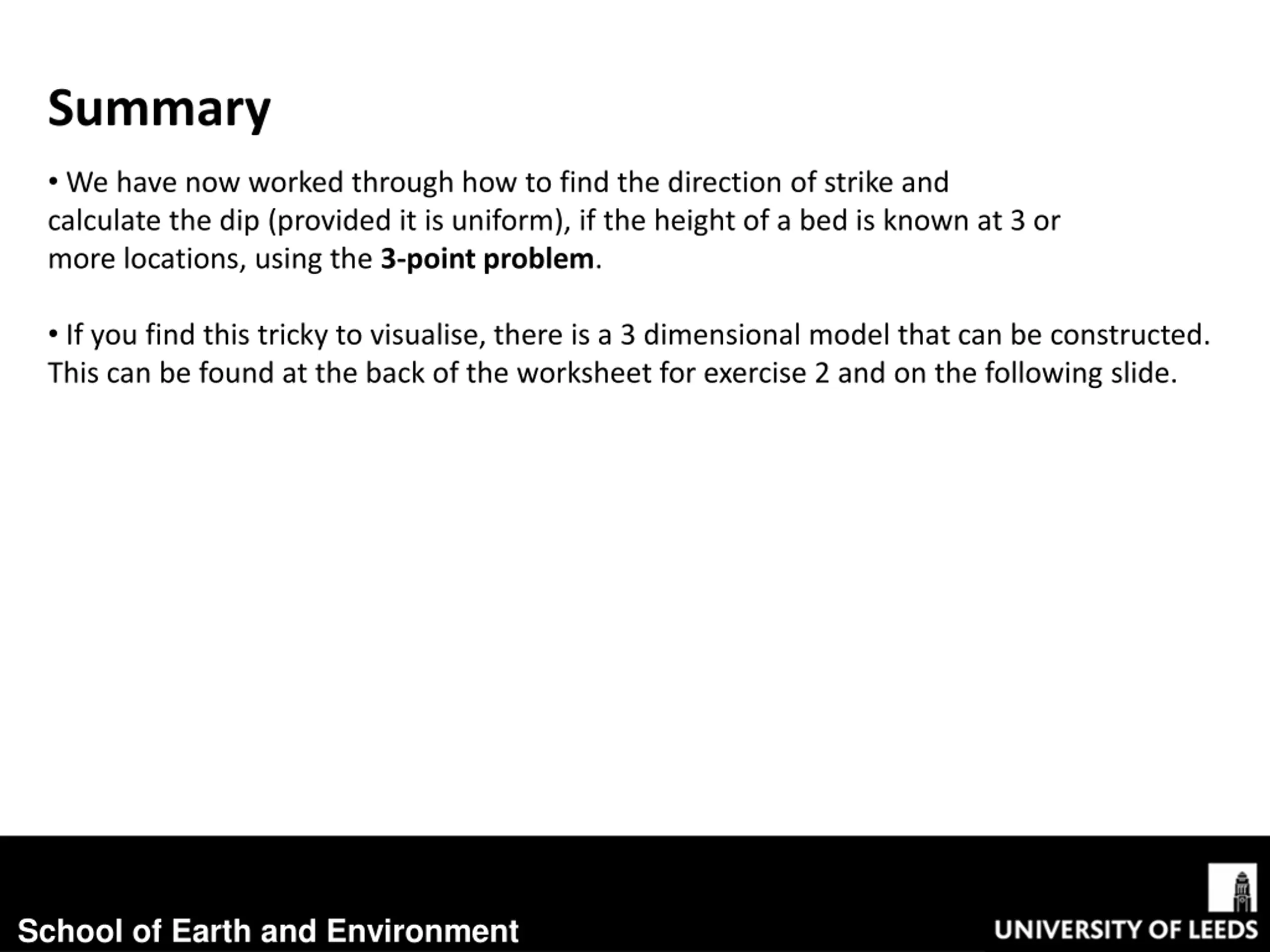 Summary We have now worked through how to find the direction of strike and calculate the dip (provided it is uniform), if the height of a bed is known at 3 or more locations, using the 3-point problem. If you find this tricky to visualise, there is a 3 dimensional model that can be constructed. This can be found at the back of the worksheet for exercise 2 and on the following slide. School of Earth and Environment