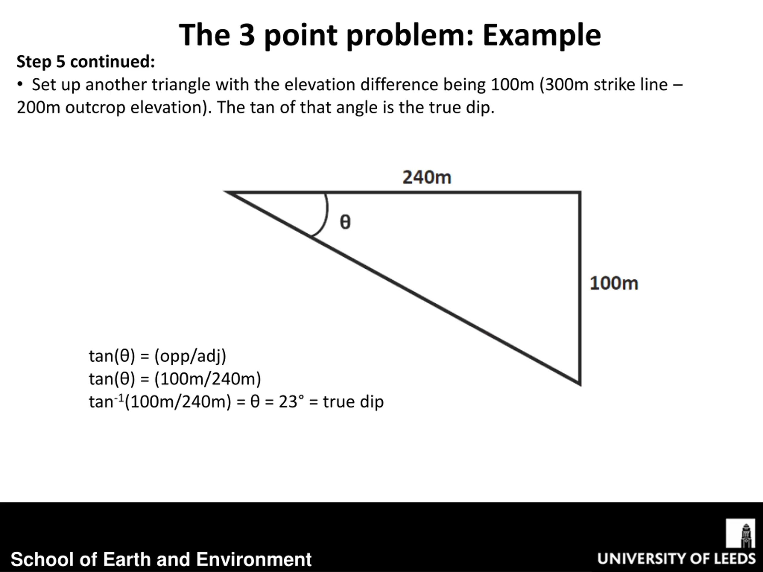 The 3 point problem: Example Step 5 continued: Set up another triangle with the elevation difference being 100m (300m strike line 200m outcrop elevation). The tan of that angle is the true dip. tan( ) = (opp/adj) tan( ) = (100m/240m) tan-1(100m/240m) = = 23 = true dip School of Earth and Environment