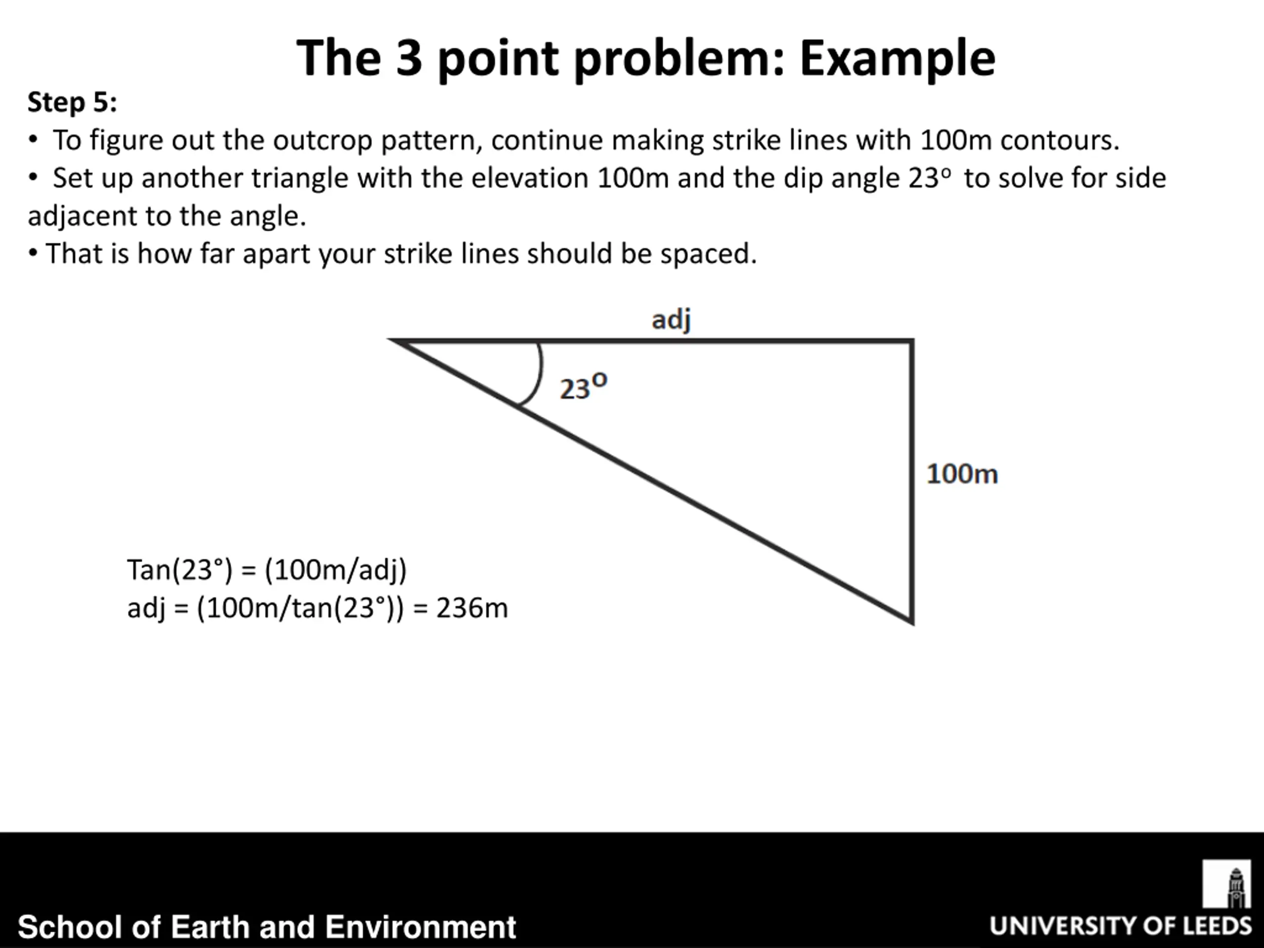 The 3 point problem: Example Step 5: To figure out the outcrop pattern, continue making strike lines with 100m contours. Set up another triangle with the elevation 100m and the dip angle 23o to solve for side adjacent to the angle. That is how far apart your strike lines should be spaced. Tan(23 ) = (100m/adj) adj = (100m/tan(23 )) = 236m School of Earth and Environment