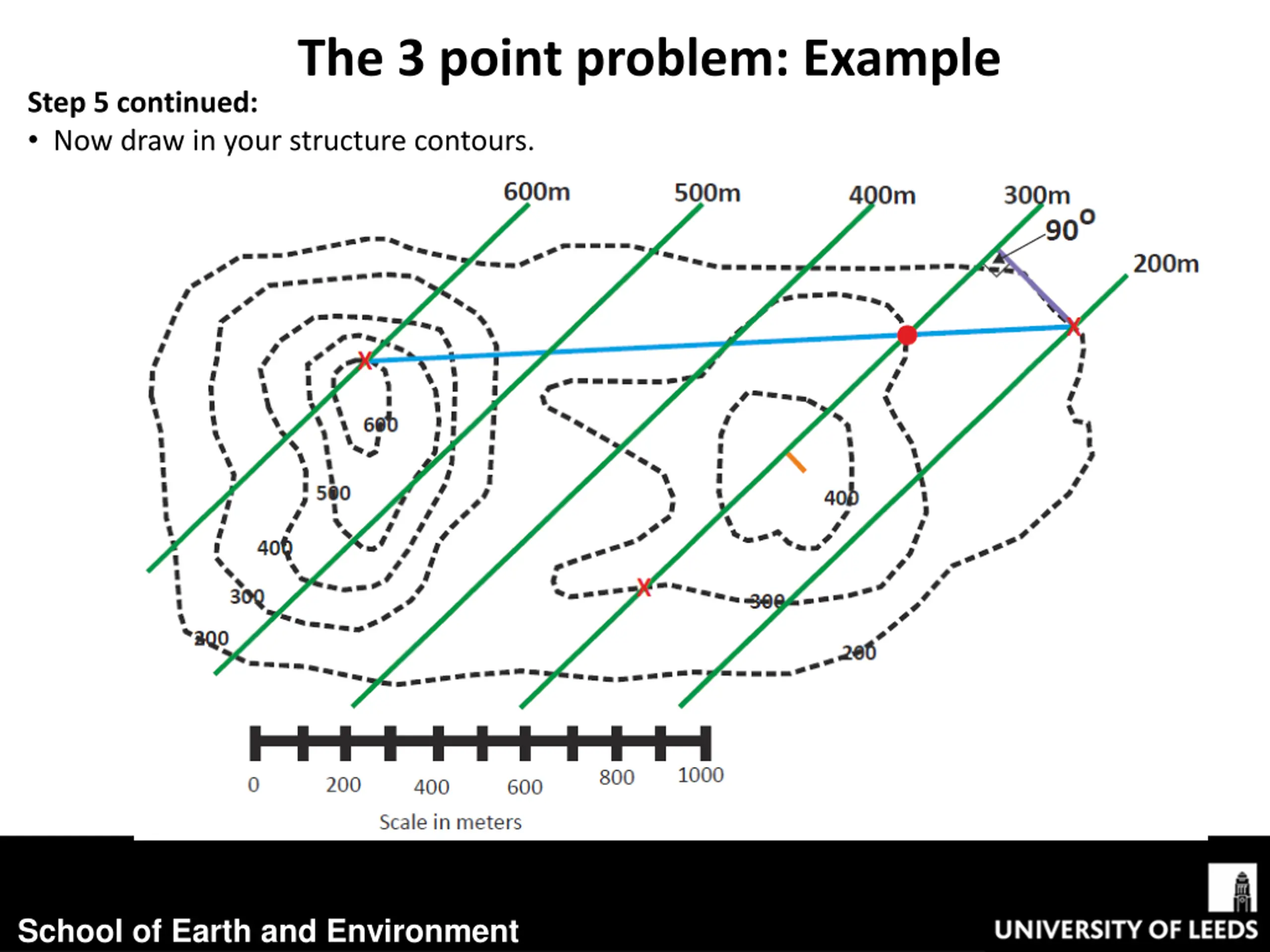 The 3 point problem: Example Step 5 continued: After you ve drawn in your structure contours (they should be evenly spaced), make a mark (the yellow dots) every time a structure contour crosses a topographic contour of the same value. School of Earth and Environment