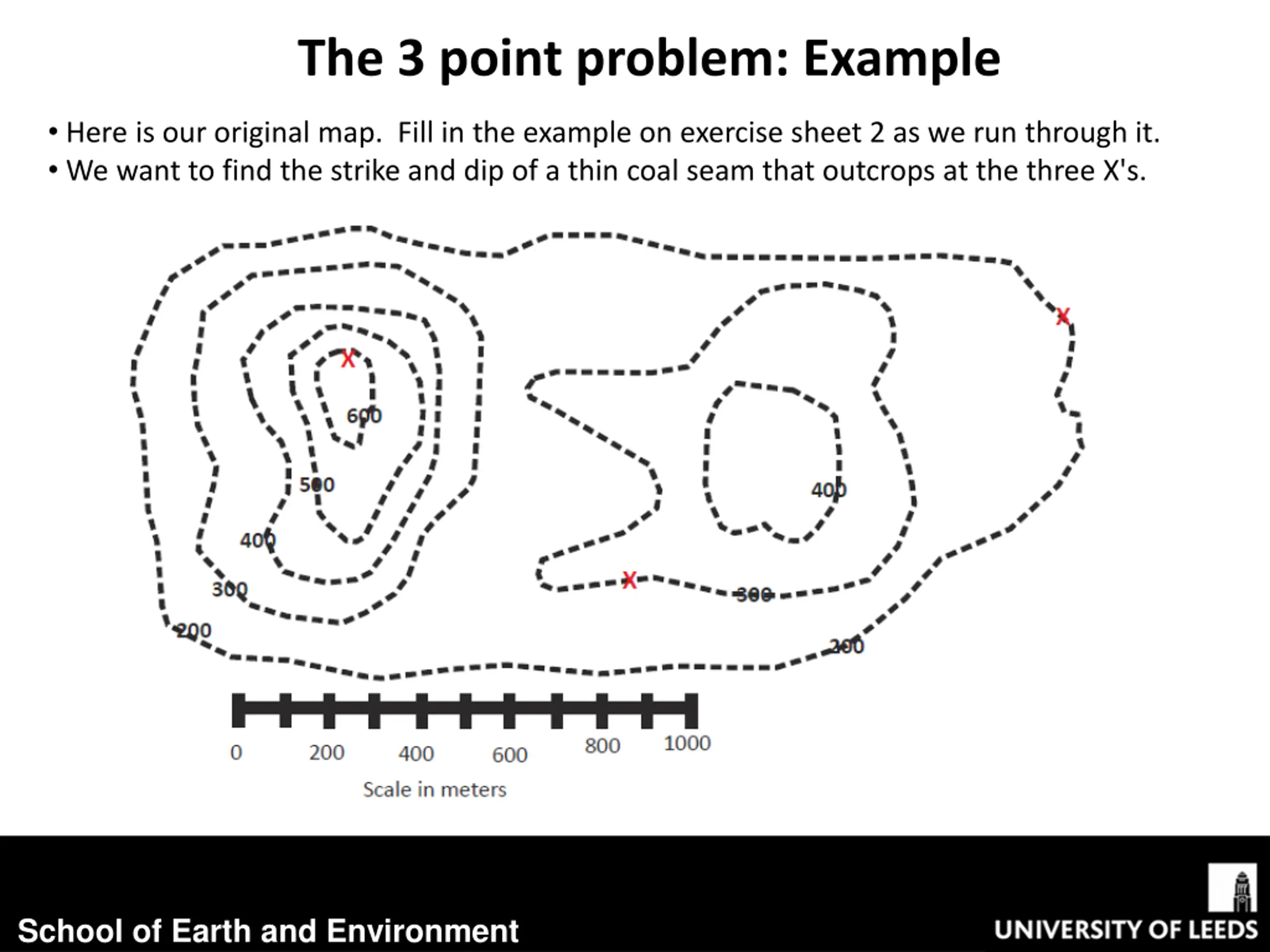 The 3 point problem: Example Here is our original map. Fill in the example on exercise sheet 2 as we run through it. We want to find the strike and dip of a thin coal seam that outcrops at the three X's. School of Earth and Environment