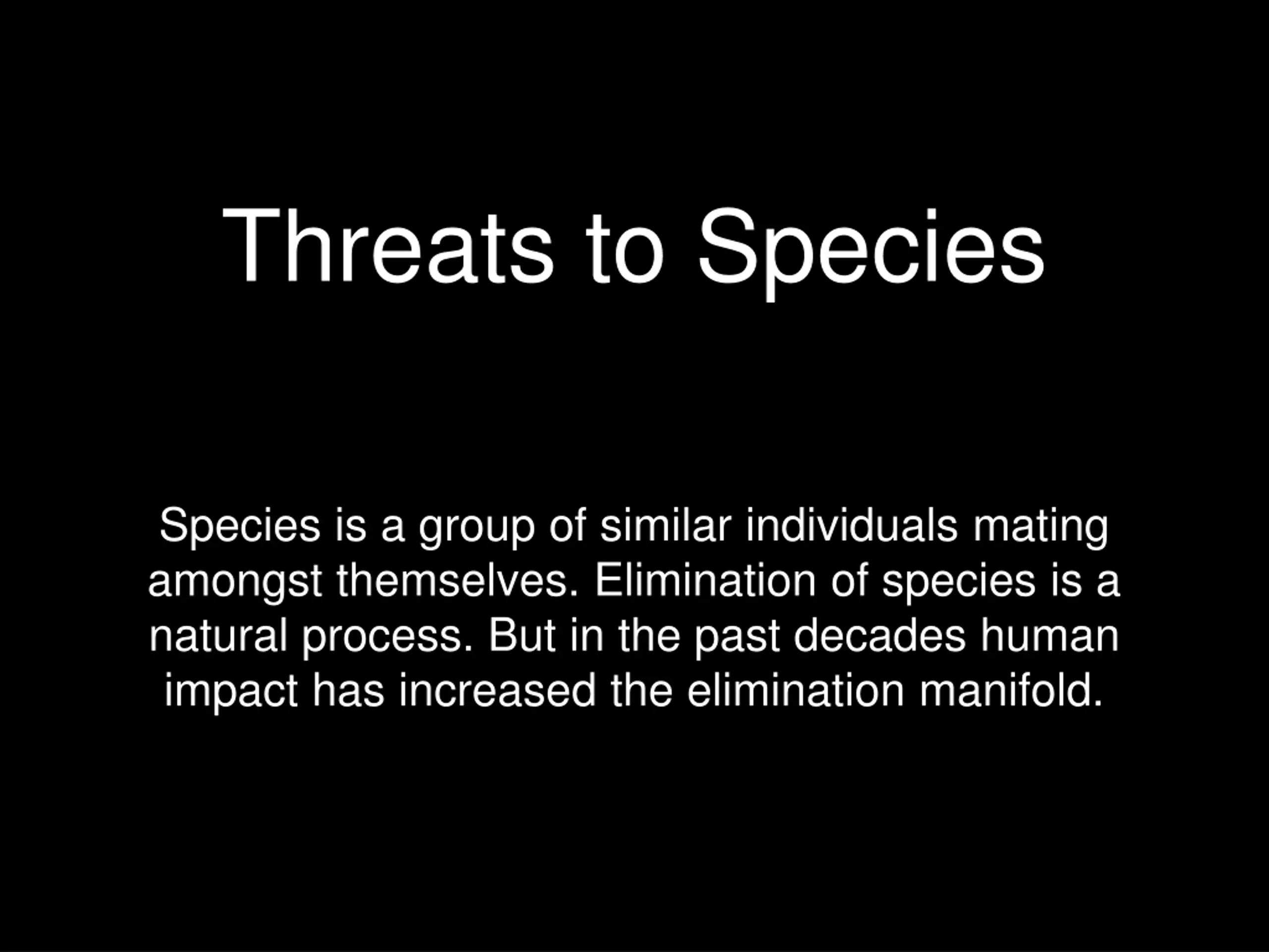 Threats to Species Species is a group of similar individuals mating amongst themselves. Elimination of species is a natural process. But in the past decades human impact has increased the elimination manifold.