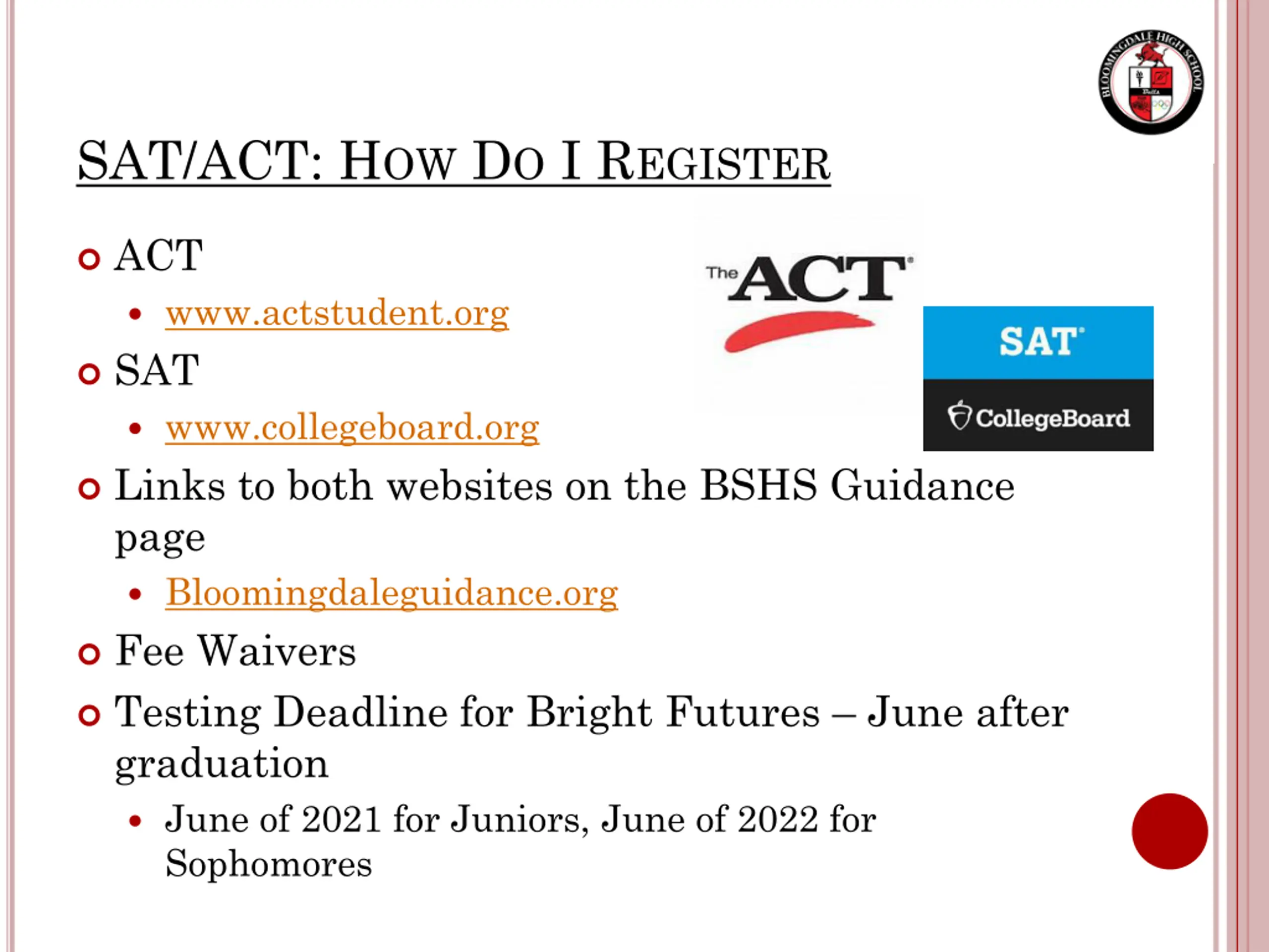 SAT/ACT: HOW DO I REGISTER ACT www.actstudent.org SAT www.collegeboard.org Links to both websites on the BSHS Guidance page Bloomingdaleguidance.org Fee Waivers Testing Deadline for Bright Futures June after graduation June of 2021 for Juniors, June of 2022 for Sophomores