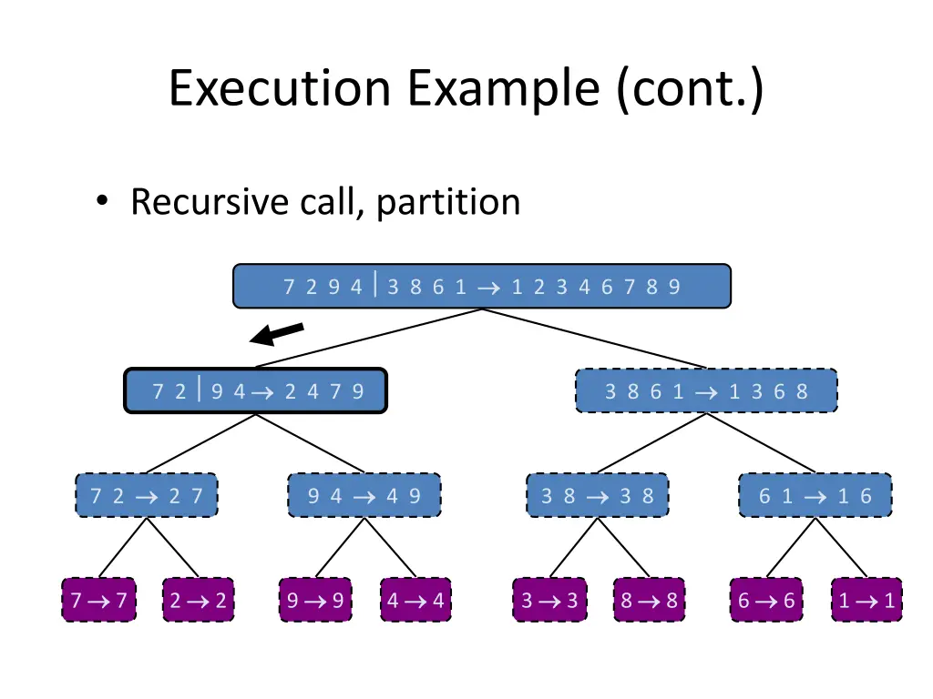 Execution Example (cont.) Recursive call, base case 7 2 9 4 3 8 6 1 1 2 3 4 6 7 8 9 7 2 9 4 2 4 7 9 3 8 6 1 1 3 6 8 7 2 2 7 9 4 4 9 3 8 3 8 6 1 1 6 7 7 2 2 9 9 4 4 3 3 8 8 6 6 1 1
