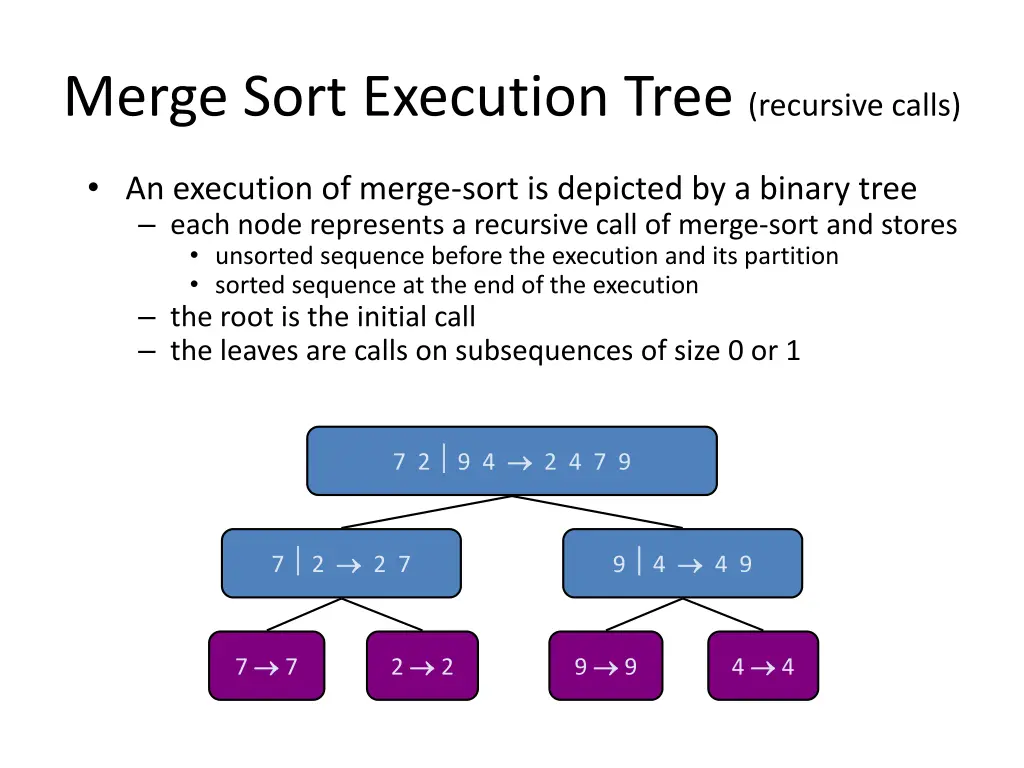 Merge Sort Execution Tree (recursive calls) An execution of merge-sort is depicted by a binary tree each node represents a recursive call of merge-sort and stores unsorted sequence before the execution and its partition sorted sequence at the end of the execution the root is the initial call the leaves are calls on subsequences of size 0 or 1 7 2 9 4 2 4 7 9 7 2 2 7 9 4 4 9 7 7 2 2 9 9 4 4