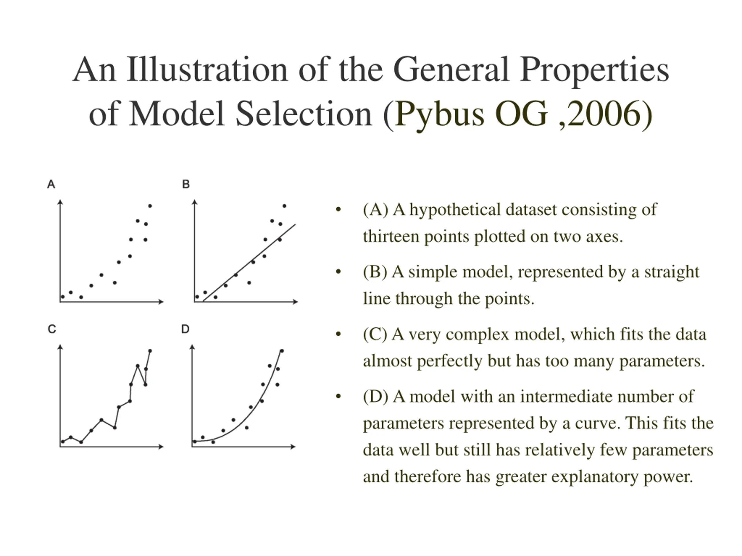 An Illustration of the General Properties of Model Selection (Pybus OG ,2006) (A) A hypothetical dataset consisting of thirteen points plotted on two axes. (B) A simple model, represented by a straight line through the points. (C) A very complex model, which fits the data almost perfectly but has too many parameters. (D) A model with an intermediate number of parameters represented by a curve. This fits the data well but still has relatively few parameters and therefore has greater explanatory power.
