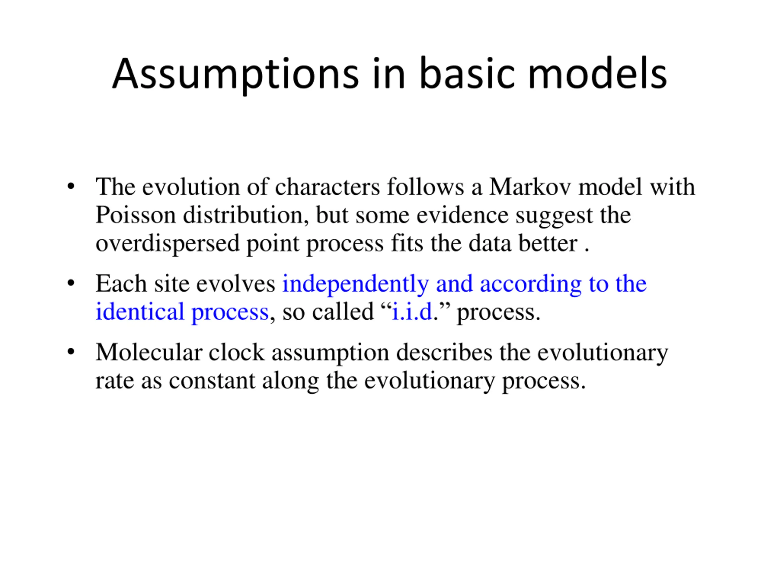 Assumptions in basic models The evolution of characters follows a Markov model with Poisson distribution, but some evidence suggest the overdispersed point process fits the data better . Each site evolves independently and according to the identical process, so called i.i.d. process. Molecular clock assumption describes the evolutionary rate as constant along the evolutionary process.