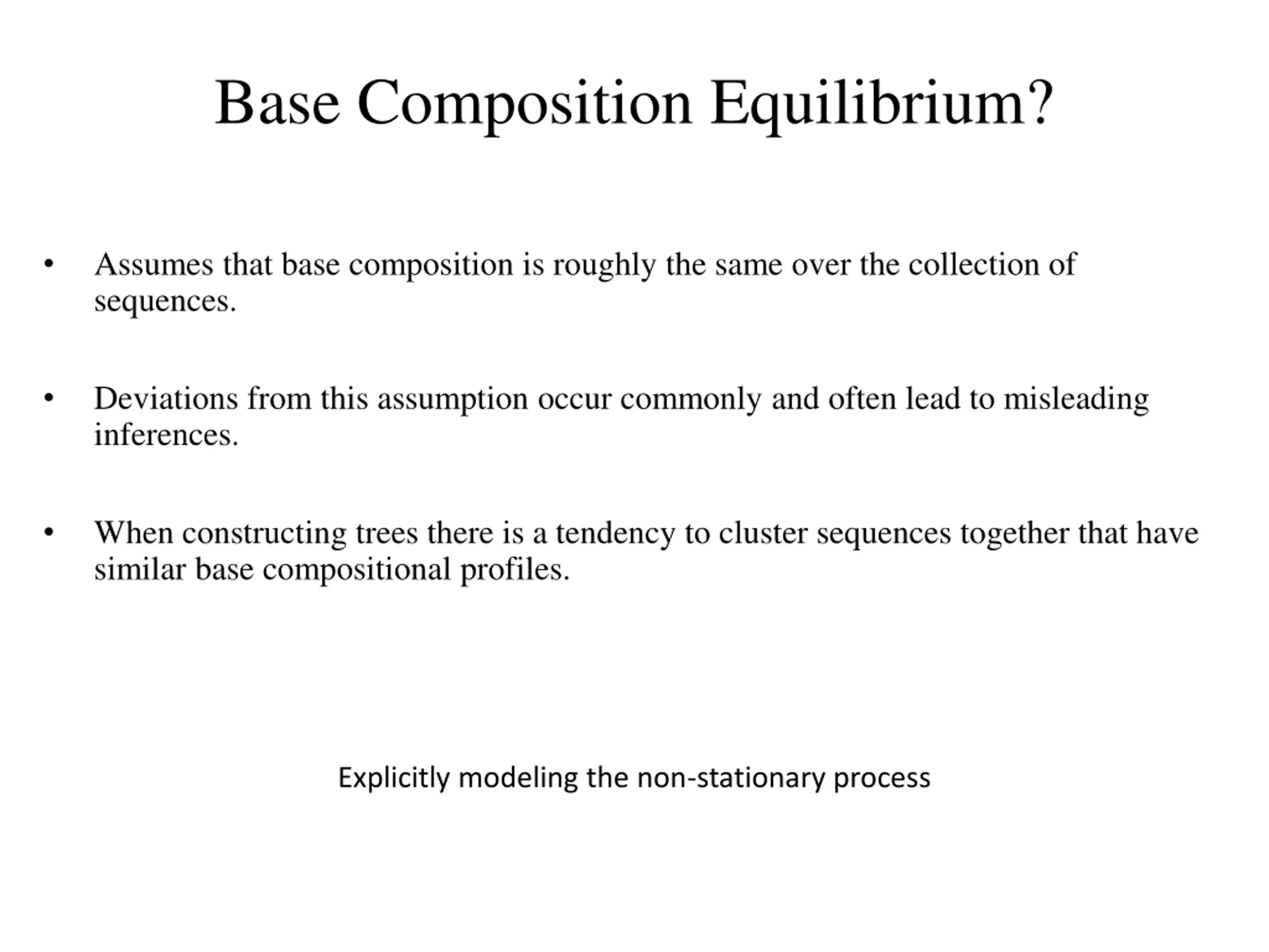 Base Composition Equilibrium? Assumes that base composition is roughly the same over the collection of sequences. Deviations from this assumption occur commonly and often lead to misleading inferences. When constructing trees there is a tendency to cluster sequences together that have similar base compositional profiles. Explicitly modeling the non-stationary process