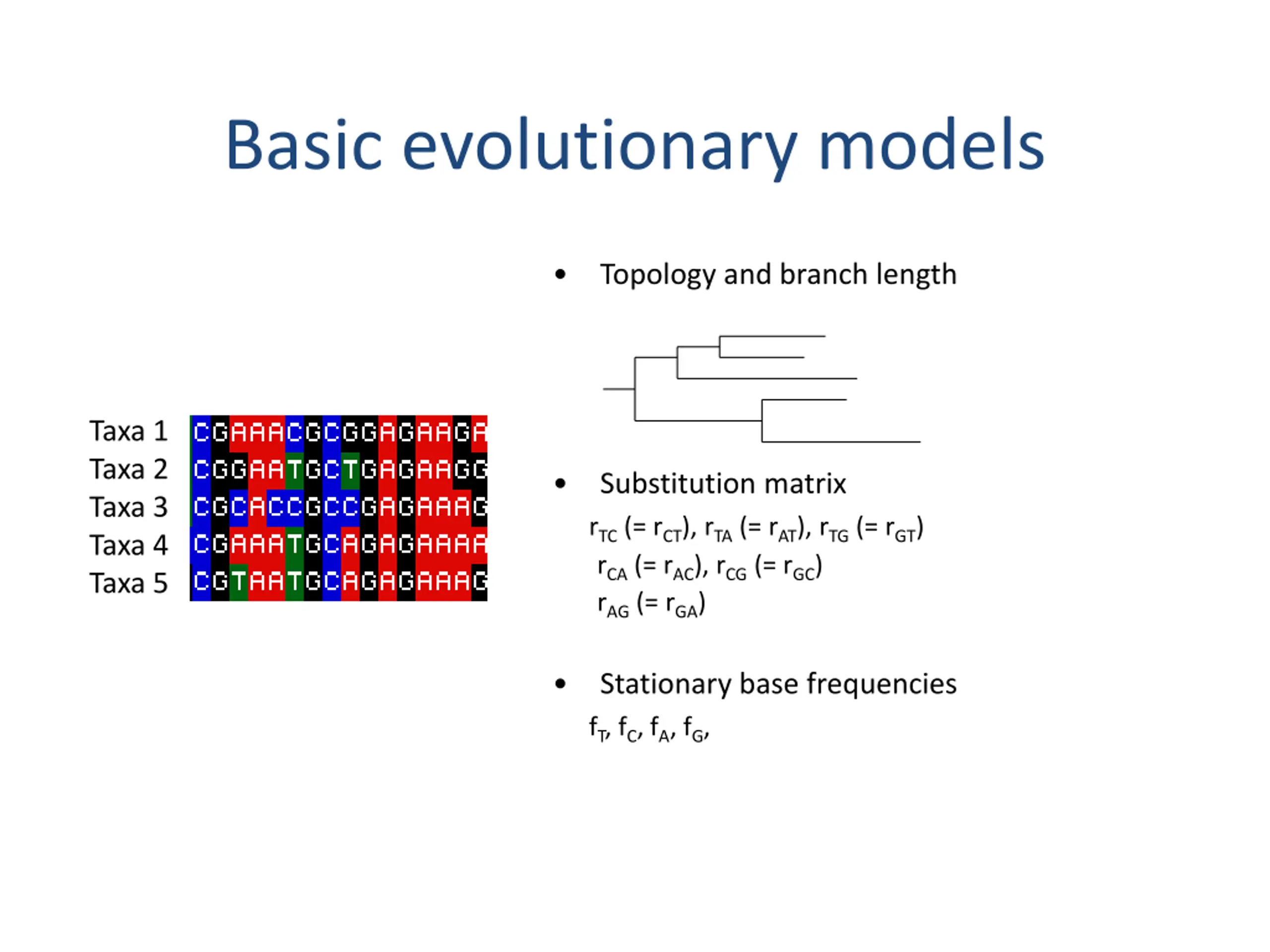 Basic evolutionary models Topology and branch length Taxa 1 Taxa 2 Taxa 3 Taxa 4 Taxa 5 rTC (= rCT), rTA (= rAT), rTG (= rGT) rCA (= rAC), rCG (= rGC) rAG (= rGA) Substitution matrix fT, fC, fA, fG, Stationary base frequencies