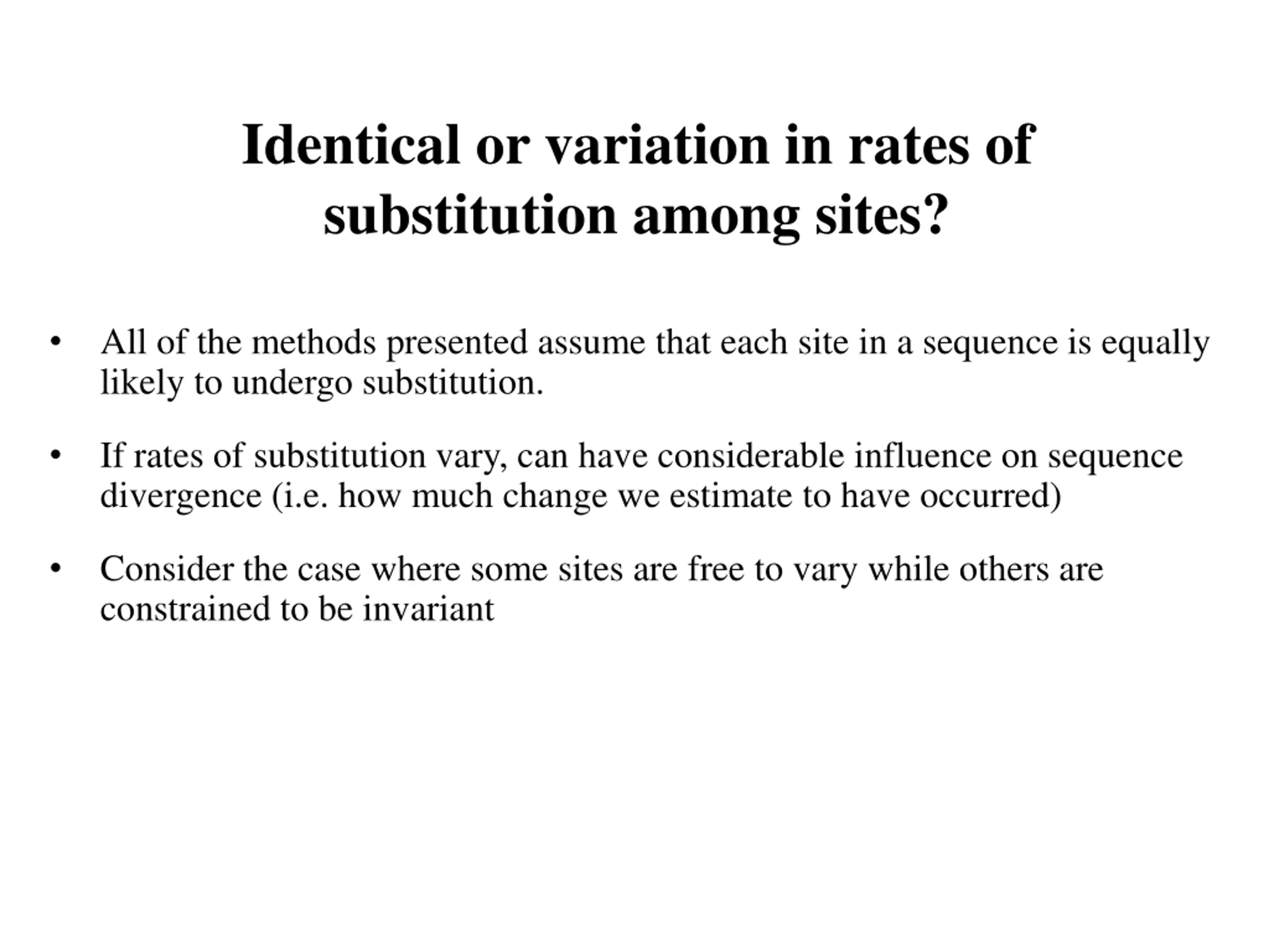 Identical or variation in rates of substitution among sites? All of the methods presented assume that each site in a sequence is equally likely to undergo substitution. If rates of substitution vary, can have considerable influence on sequence divergence (i.e. how much change we estimate to have occurred) Consider the case where some sites are free to vary while others are constrained to be invariant