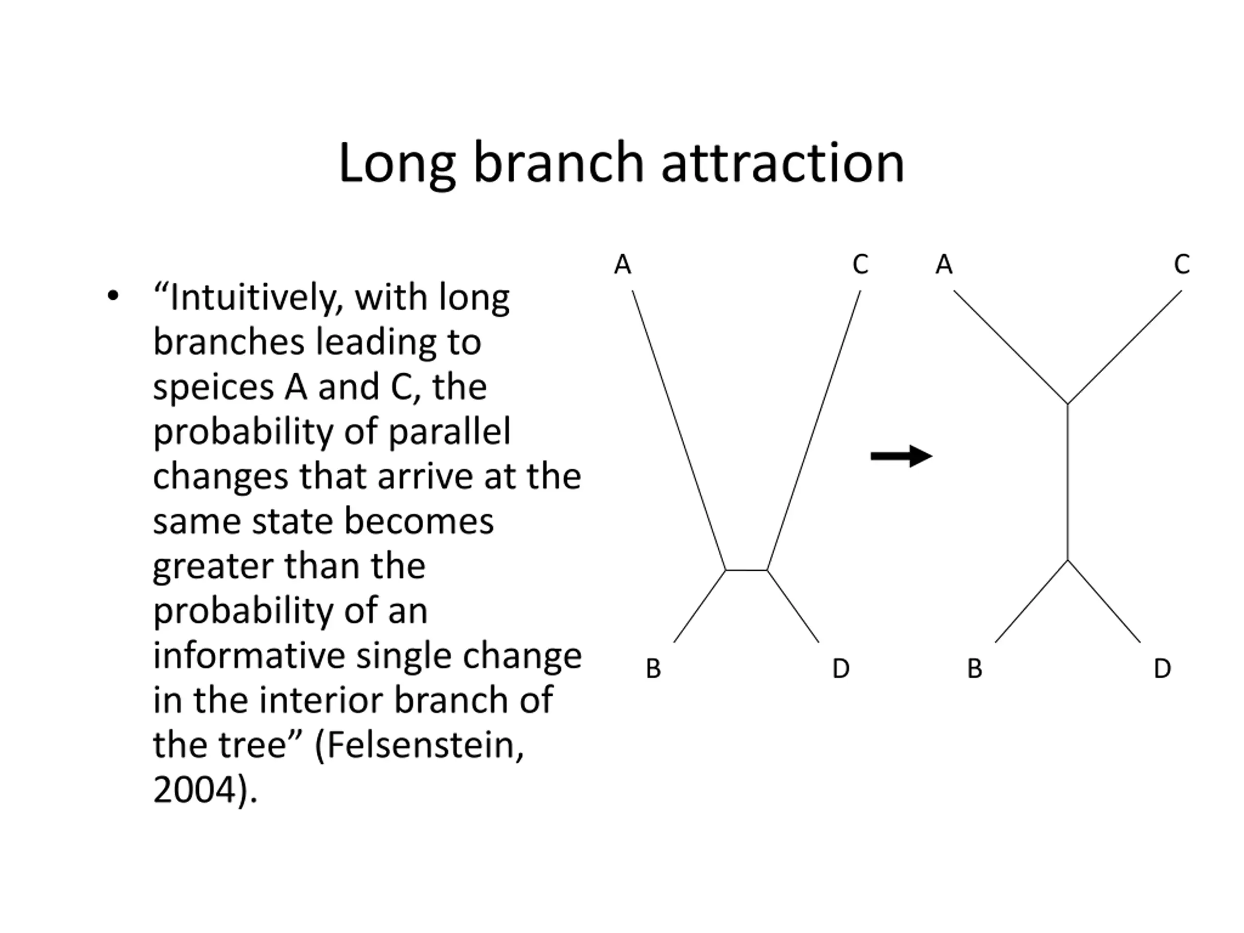 Long branch attraction A C A C Intuitively, with long branches leading to speices A and C, the probability of parallel changes that arrive at the same state becomes greater than the probability of an informative single change in the interior branch of the tree (Felsenstein, 2004). B D B D