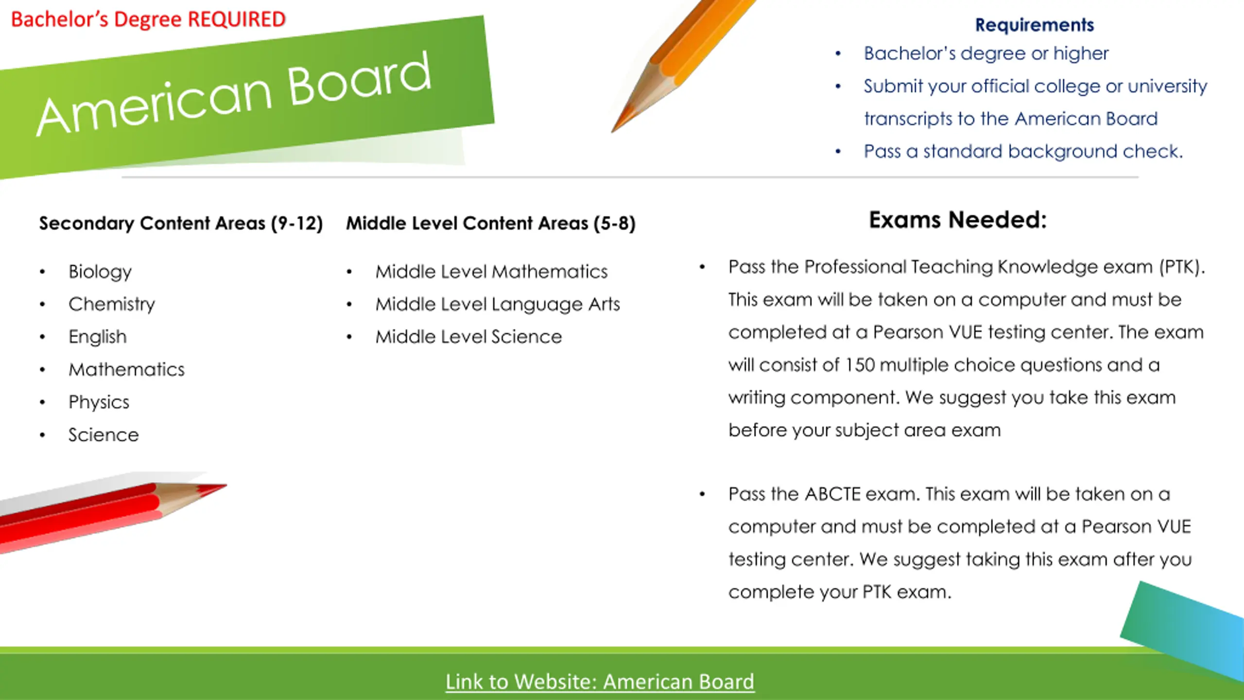 Bachelors Degree REQUIRED Requirements Bachelor s degree or higher Submit your official college or university transcripts to the American Board Pass a standard background check. Exams Needed: Secondary Content Areas (9-12) Middle Level Content Areas (5-8) Pass the Professional Teaching Knowledge exam (PTK). Biology Middle Level Mathematics This exam will be taken on a computer and must be Chemistry Middle Level Language Arts completed at a Pearson VUE testing center. The exam English Middle Level Science will consist of 150 multiple choice questions and a Mathematics writing component. We suggest you take this exam Physics before your subject area exam Science Pass the ABCTE exam. This exam will be taken on a computer and must be completed at a Pearson VUE testing center. We suggest taking this exam after you complete your PTK exam. Link to Website: American Board