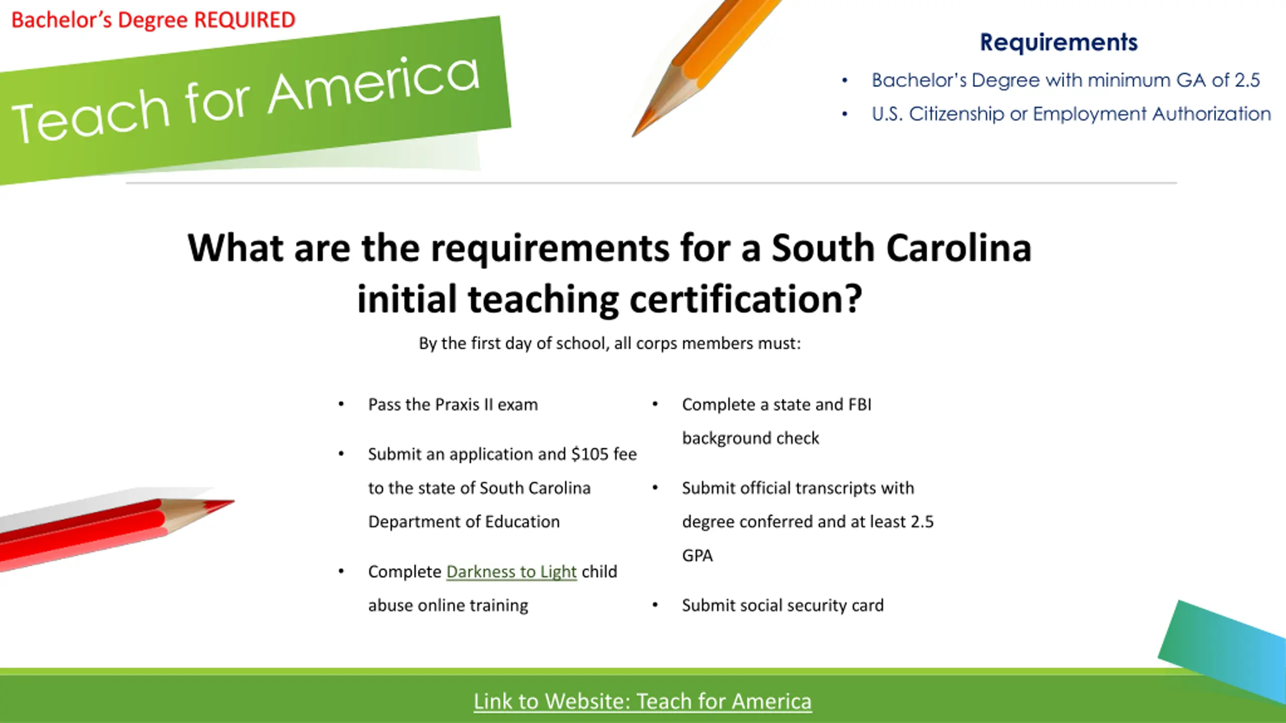 Bachelors Degree REQUIRED Requirements Bachelor s Degree with minimum GA of 2.5 U.S. Citizenship or Employment Authorization What are the requirements for a South Carolina initial teaching certification? By the first day of school, all corps members must: Pass the Praxis II exam Complete a state and FBI background check Submit an application and $105 fee to the state of South Carolina Submit official transcripts with Department of Education degree conferred and at least 2.5 GPA Complete Darkness to Light child abuse online training Submit social security card Link to Website: Teach for America