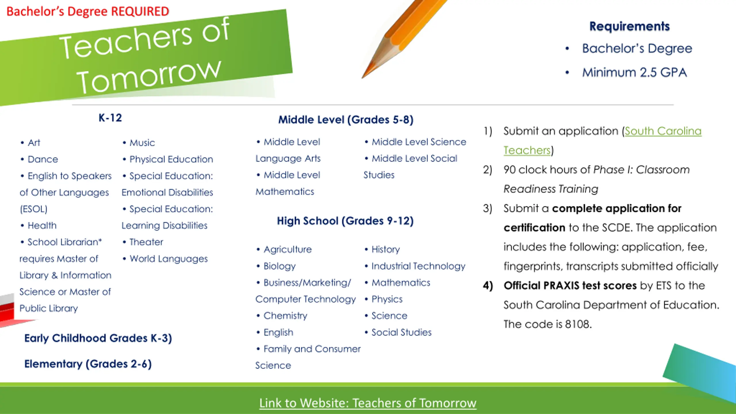 Bachelors Degree REQUIRED Requirements Bachelor s Degree Minimum 2.5 GPA K-12 Middle Level (Grades 5-8) 1) Submit an application (South Carolina Middle Level Middle Level Science Art Music Teachers) Language Arts Middle Level Social Dance Physical Education 2) 90 clock hours of Phase I: Classroom Middle Level Studies English to Speakers Special Education: Readiness Training Mathematics of Other Languages Emotional Disabilities 3) Submit a complete application for (ESOL) Special Education: High School (Grades 9-12) Health Learning Disabilities certification to the SCDE. The application School Librarian* Theater includes the following: application, fee, Agriculture History requires Master of World Languages fingerprints, transcripts submitted officially Biology Industrial Technology Library & Information Business/Marketing/ Mathematics 4) Official PRAXIS test scores by ETS to the Science or Master of Computer Technology Physics South Carolina Department of Education. Public Library Chemistry Science The code is 8108. English Social Studies Early Childhood Grades K-3) Family and Consumer Elementary (Grades 2-6) Science Link to Website: Teachers of Tomorrow