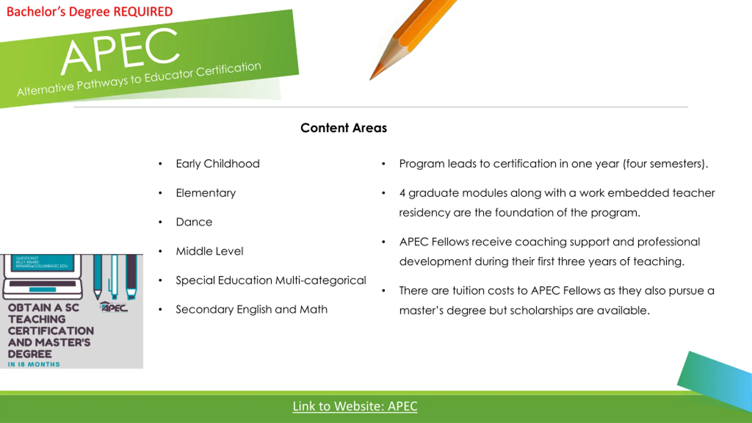 Bachelors Degree REQUIRED Content Areas Early Childhood Program leads to certification in one year (four semesters). Elementary 4 graduate modules along with a work embedded teacher residency are the foundation of the program. Dance APEC Fellows receive coaching support and professional Middle Level development during their first three years of teaching. Special Education Multi-categorical There are tuition costs to APEC Fellows as they also pursue a Secondary English and Math master s degree but scholarships are available. Link to Website: APEC