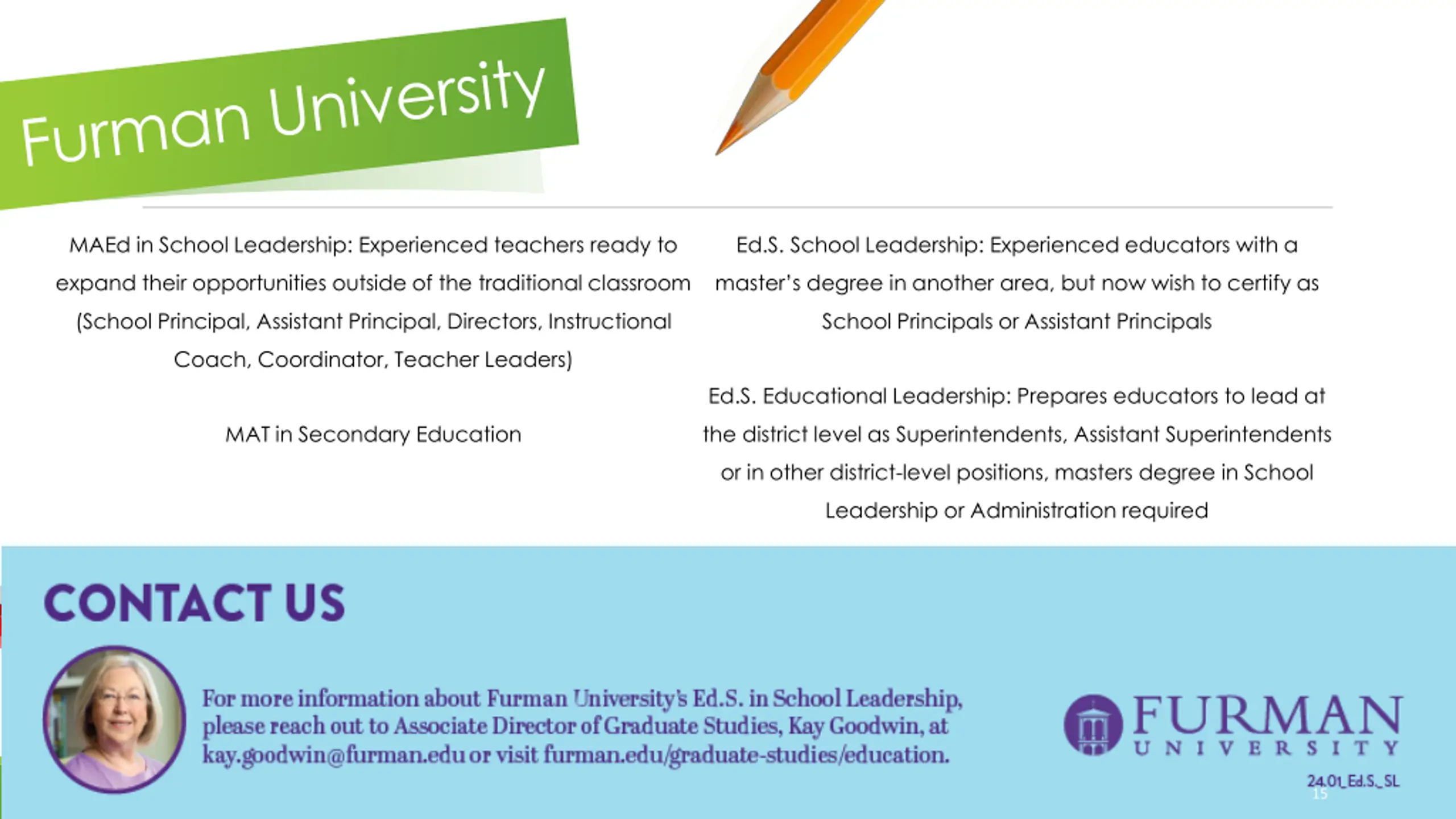 MAEd in School Leadership: Experienced teachers ready to Ed.S. School Leadership: Experienced educators with a expand their opportunities outside of the traditional classroom master s degree in another area, but now wish to certify as (School Principal, Assistant Principal, Directors, Instructional School Principals or Assistant Principals Coach, Coordinator, Teacher Leaders) Ed.S. Educational Leadership: Prepares educators to lead at MAT in Secondary Education the district level as Superintendents, Assistant Superintendents or in other district-level positions, masters degree in School Leadership or Administration required 15