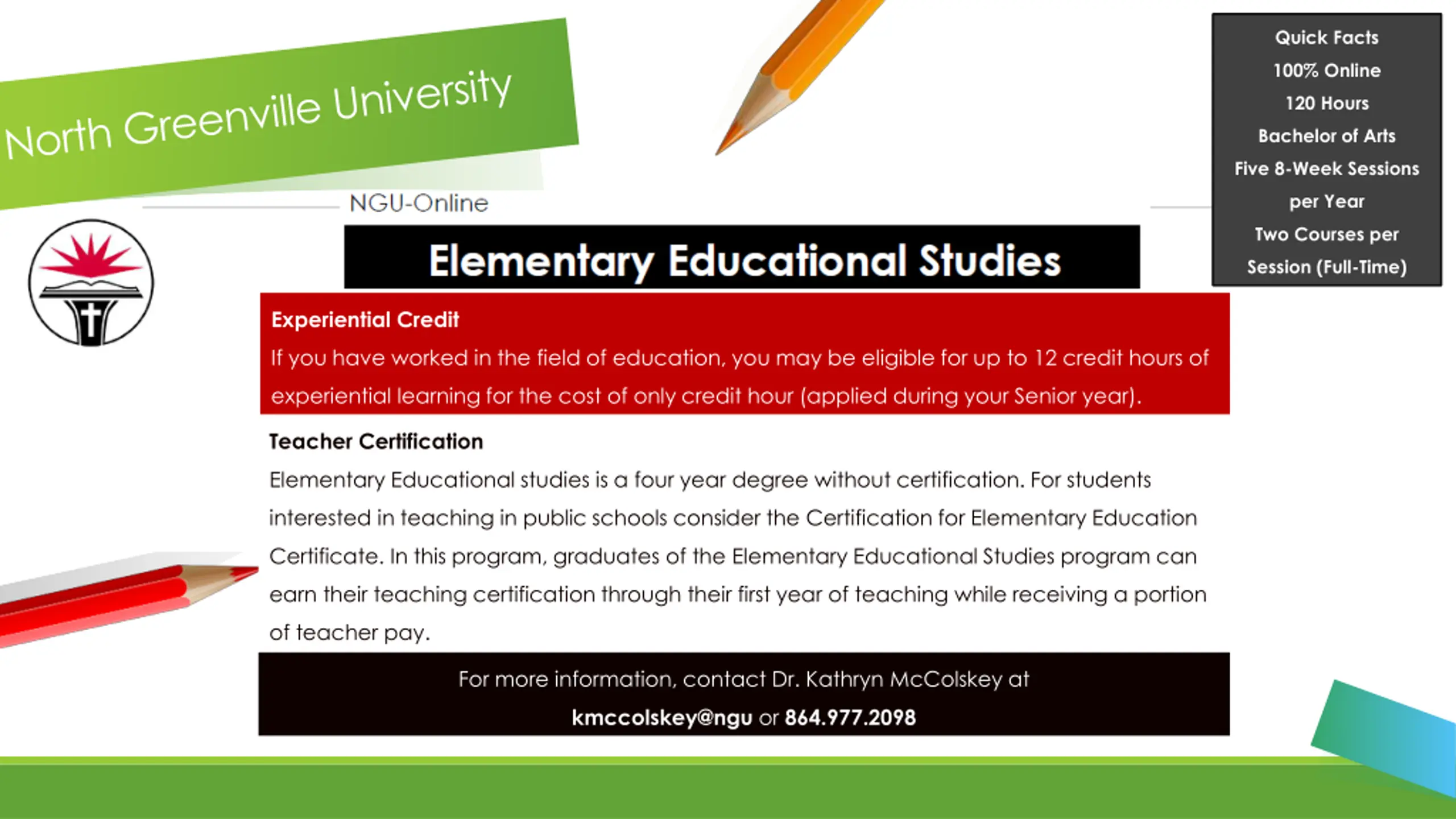 Quick Facts 100% Online 120 Hours Bachelor of Arts Five 8-Week Sessions per Year Two Courses per Session (Full-Time) Experiential Credit If you have worked in the field of education, you may be eligible for up to 12 credit hours of experiential learning for the cost of only credit hour (applied during your Senior year). Teacher Certification Elementary Educational studies is a four year degree without certification. For students interested in teaching in public schools consider the Certification for Elementary Education Certificate. In this program, graduates of the Elementary Educational Studies program can earn their teaching certification through their first year of teaching while receiving a portion of teacher pay. For more information, contact Dr. Kathryn McColskey at kmccolskey@ngu or 864.977.2098