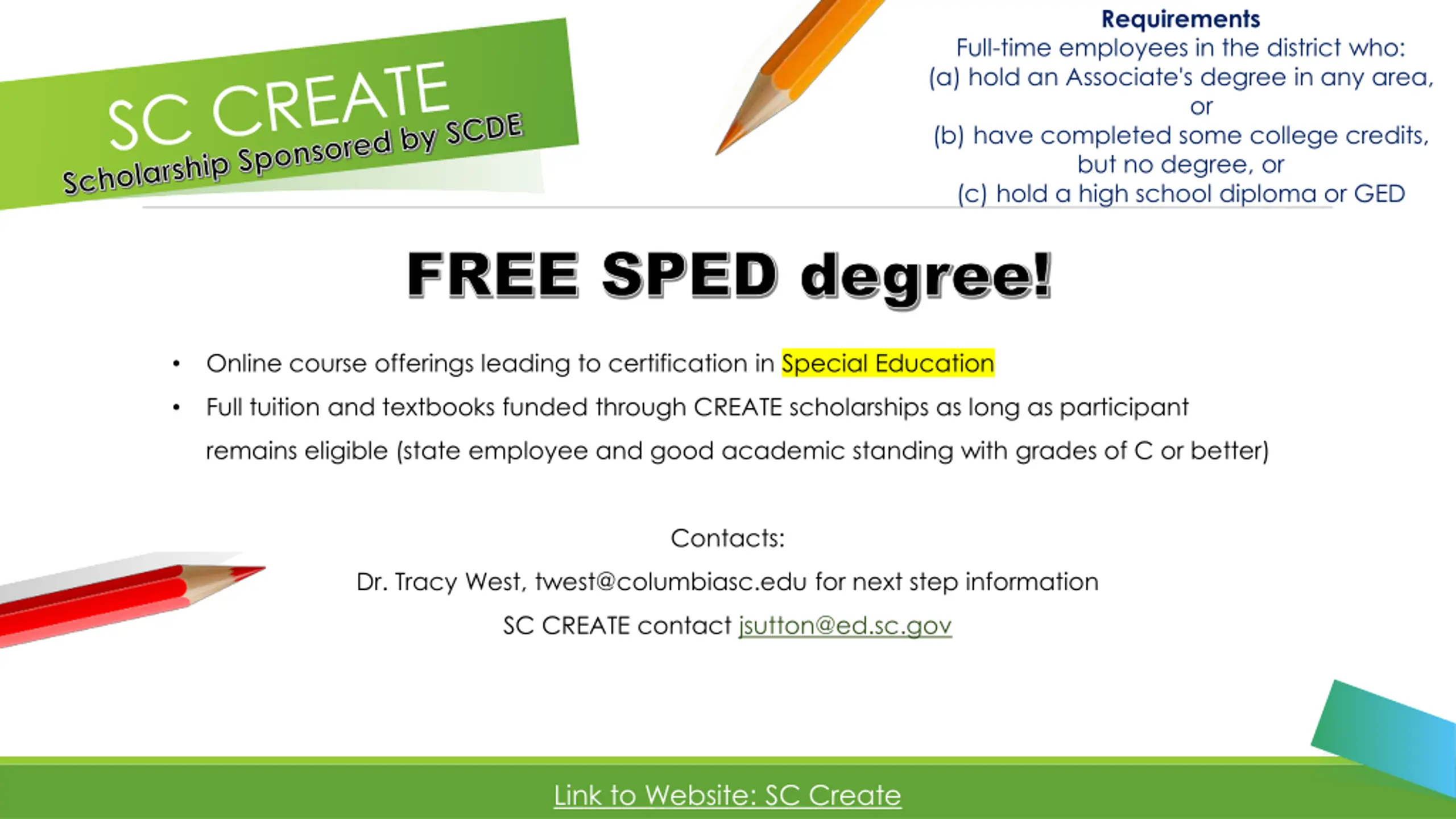Requirements Full-time employees in the district who: (a) hold an Associate's degree in any area, or Scholarship Sponsored by SCDE (b) have completed some college credits, but no degree, or (c) hold a high school diploma or GED FREE SPED degree! FREE SPED degree! Online course offerings leading to certification in Special Education Full tuition and textbooks funded through CREATE scholarships as long as participant remains eligible (state employee and good academic standing with grades of C or better) Contacts: Dr. Tracy West, twest@columbiasc.edu for next step information SC CREATE contact jsutton@ed.sc.gov Link to Website: SC Create
