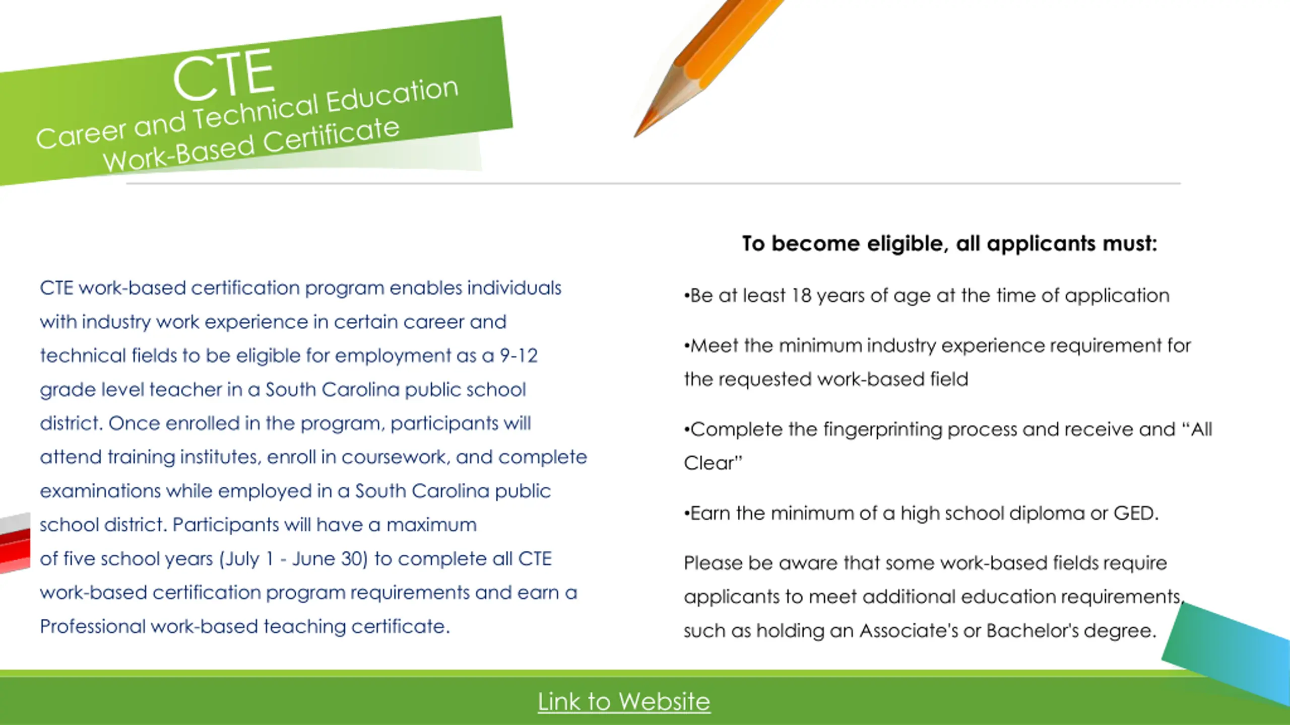 To become eligible, all applicants must: CTE work-based certification program enables individuals Be at least 18 years of age at the time of application with industry work experience in certain career and Meet the minimum industry experience requirement for technical fields to be eligible for employment as a 9-12 the requested work-based field grade level teacher in a South Carolina public school district. Once enrolled in the program, participants will Complete the fingerprinting process and receive and All attend training institutes, enroll in coursework, and complete Clear examinations while employed in a South Carolina public Earn the minimum of a high school diploma or GED. school district. Participants will have a maximum of five school years (July 1 - June 30) to complete all CTE Please be aware that some work-based fields require work-based certification program requirements and earn a applicants to meet additional education requirements, Professional work-based teaching certificate. such as holding an Associate's or Bachelor's degree. Link to Website
