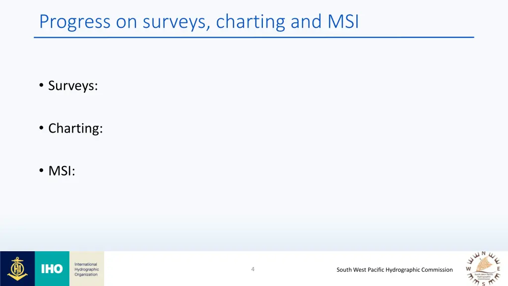 Progress on surveys, charting and MSI Surveys: Charting: MSI: 4 South West Pacific Hydrographic Commission