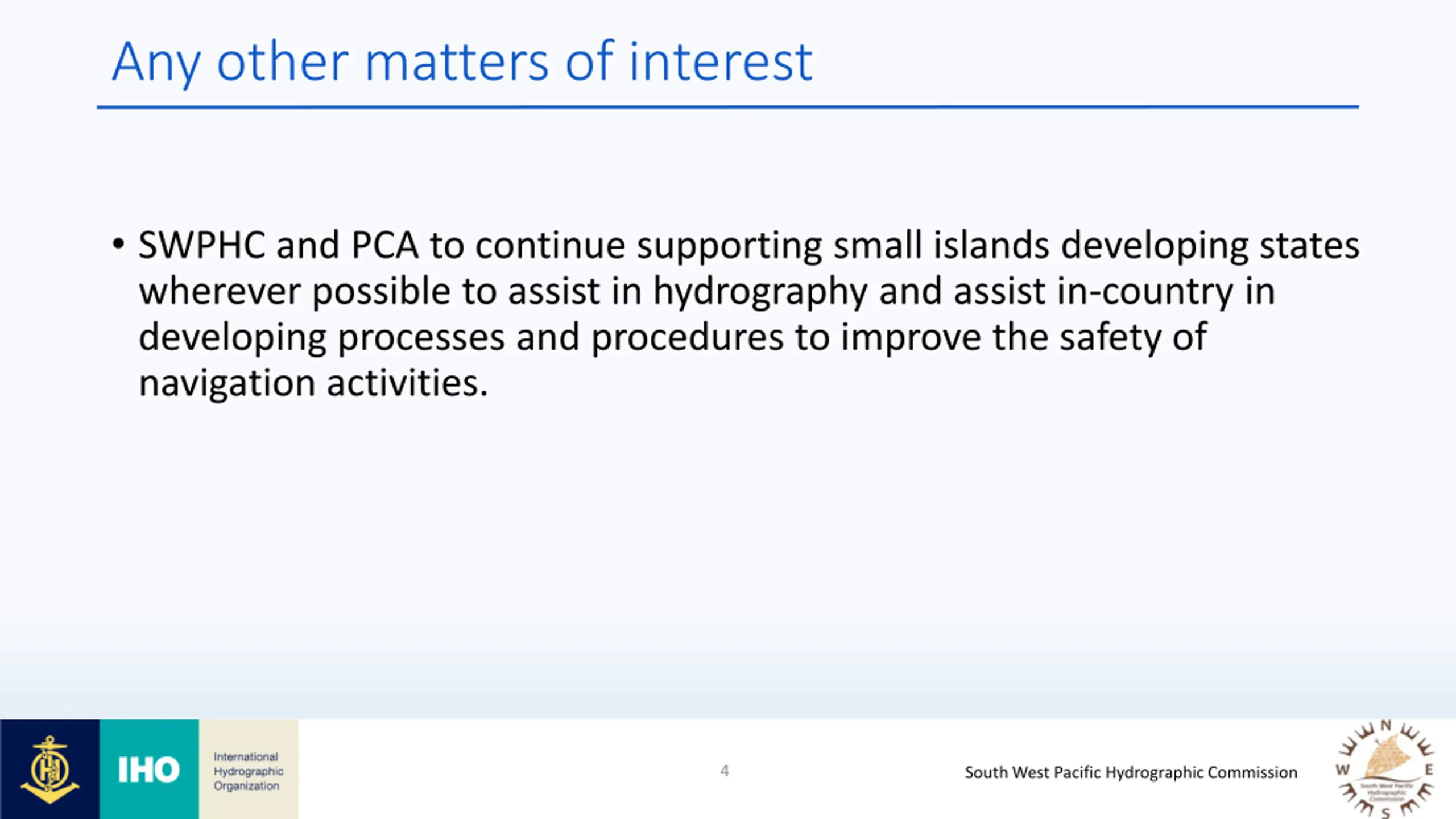 Any other matters of interest SWPHC and PCA to continue supporting small islands developing states wherever possible to assist in hydrography and assist in-country in developing processes and procedures to improve the safety of navigation activities. 4 South West Pacific Hydrographic Commission