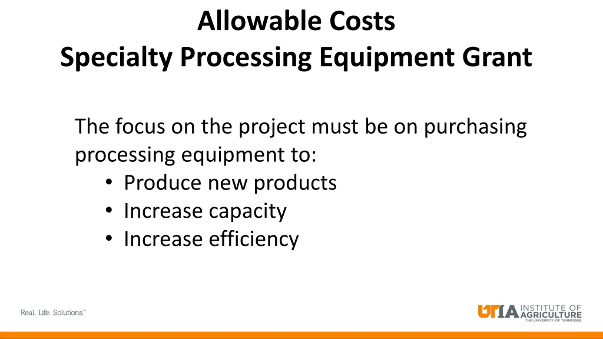 Allowable Costs Specialty Processing Equipment Grant The focus on the project must be on purchasing processing equipment to: Produce new products Increase capacity Increase efficiency