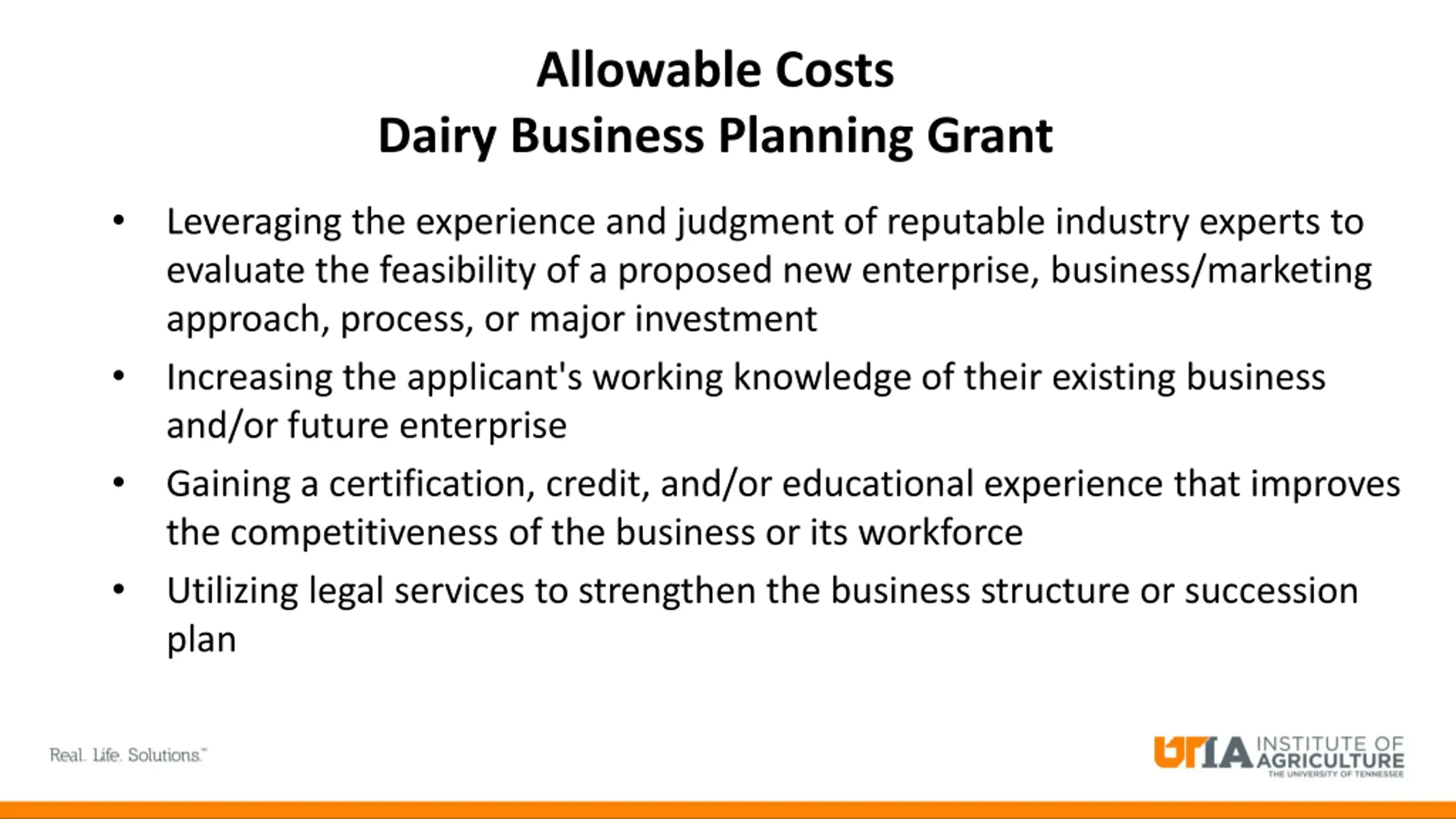Allowable Costs Dairy Business Planning Grant Leveraging the experience and judgment of reputable industry experts to evaluate the feasibility of a proposed new enterprise, business/marketing approach, process, or major investment Increasing the applicant's working knowledge of their existing business and/or future enterprise Gaining a certification, credit, and/or educational experience that improves the competitiveness of the business or its workforce Utilizing legal services to strengthen the business structure or succession plan