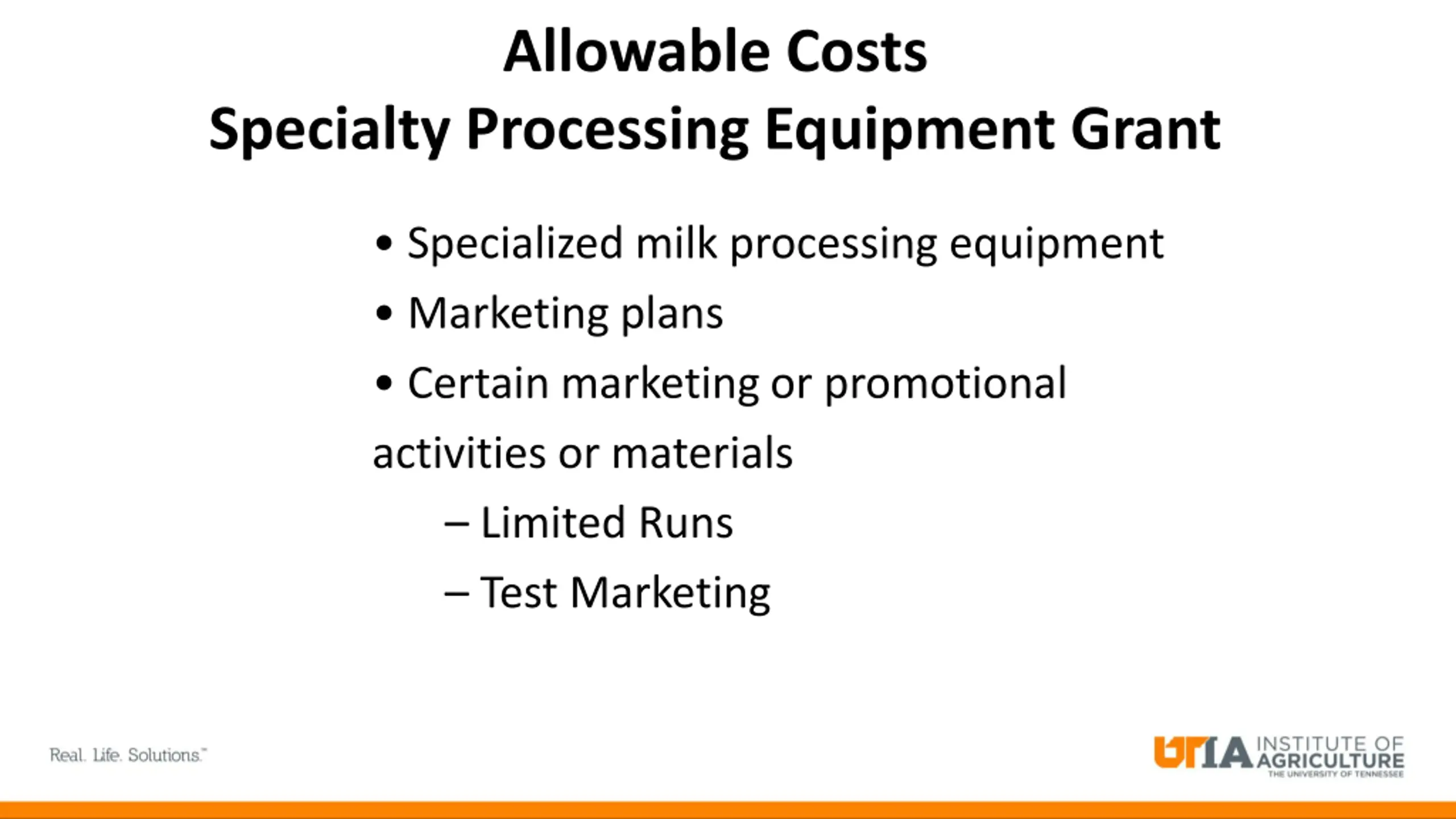 Allowable Costs Specialty Processing Equipment Grant Specialized milk processing equipment Marketing plans Certain marketing or promotional activities or materials Limited Runs Test Marketing