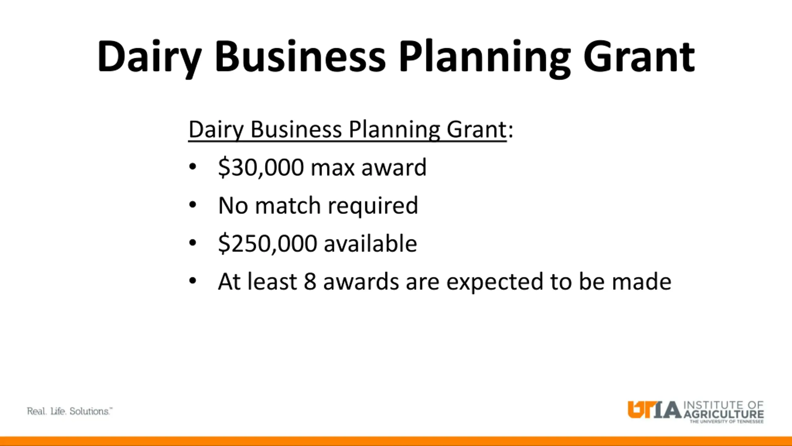 Dairy Business Planning Grant Dairy Business Planning Grant: $30,000 max award No match required $250,000 available At least 8 awards are expected to be made