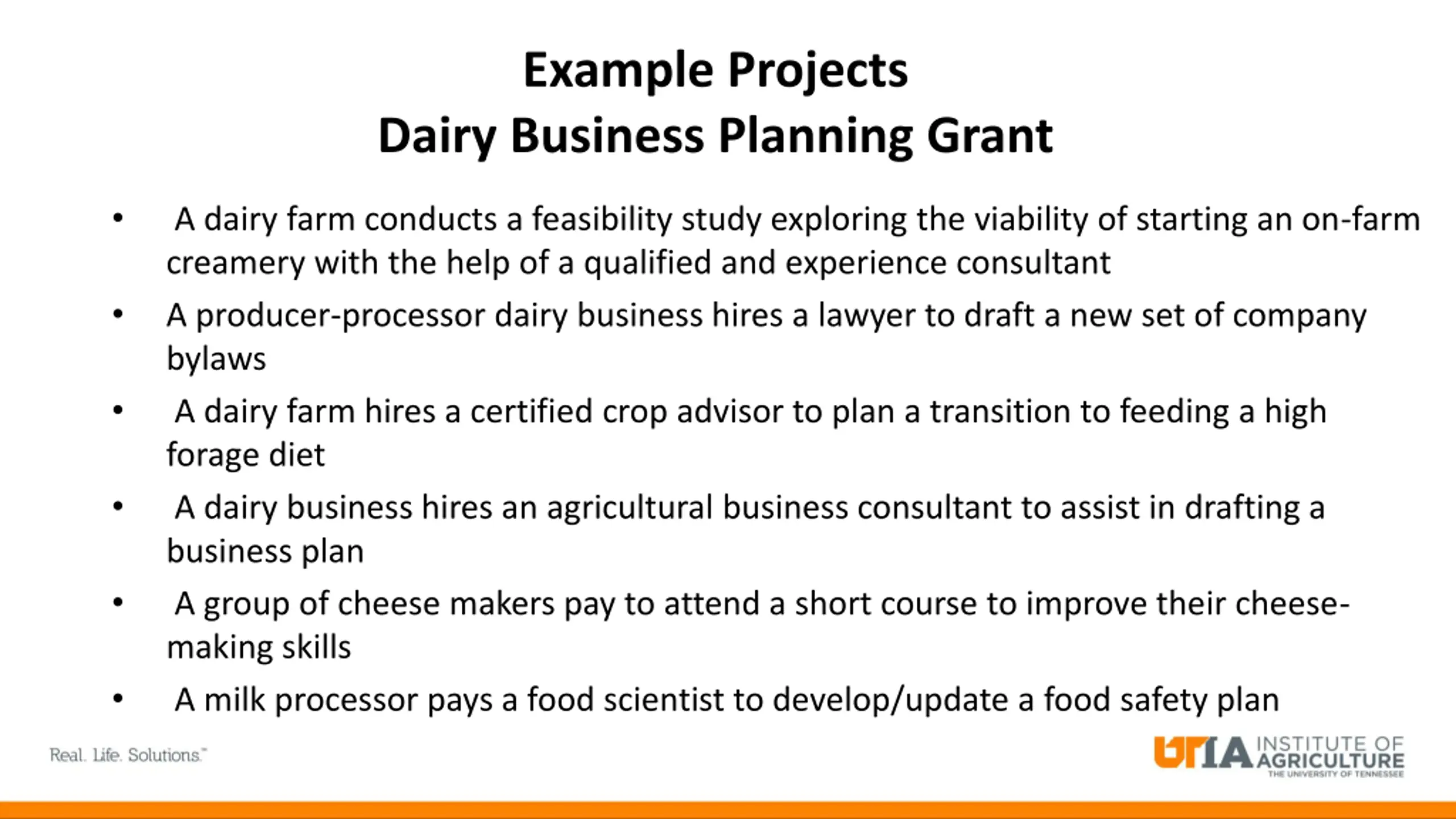 Example Projects Dairy Business Planning Grant A dairy farm conducts a feasibility study exploring the viability of starting an on-farm creamery with the help of a qualified and experience consultant A producer-processor dairy business hires a lawyer to draft a new set of company bylaws A dairy farm hires a certified crop advisor to plan a transition to feeding a high forage diet A dairy business hires an agricultural business consultant to assist in drafting a business plan A group of cheese makers pay to attend a short course to improve their cheese- making skills A milk processor pays a food scientist to develop/update a food safety plan