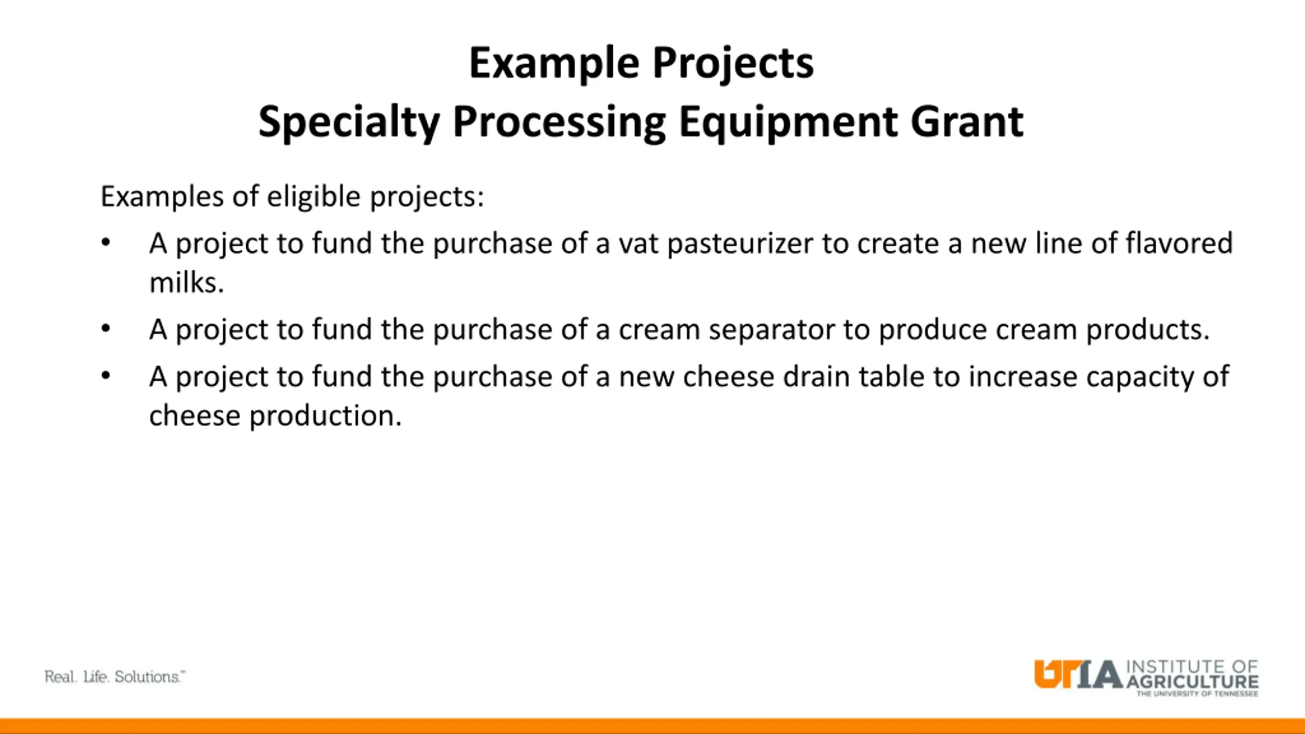 Example Projects Specialty Processing Equipment Grant Examples of eligible projects: A project to fund the purchase of a vat pasteurizer to create a new line of flavored milks. A project to fund the purchase of a cream separator to produce cream products. A project to fund the purchase of a new cheese drain table to increase capacity of cheese production.