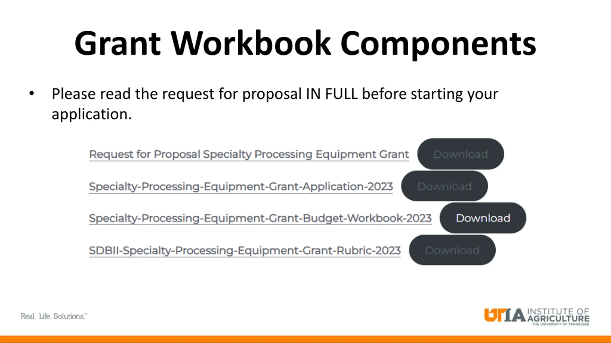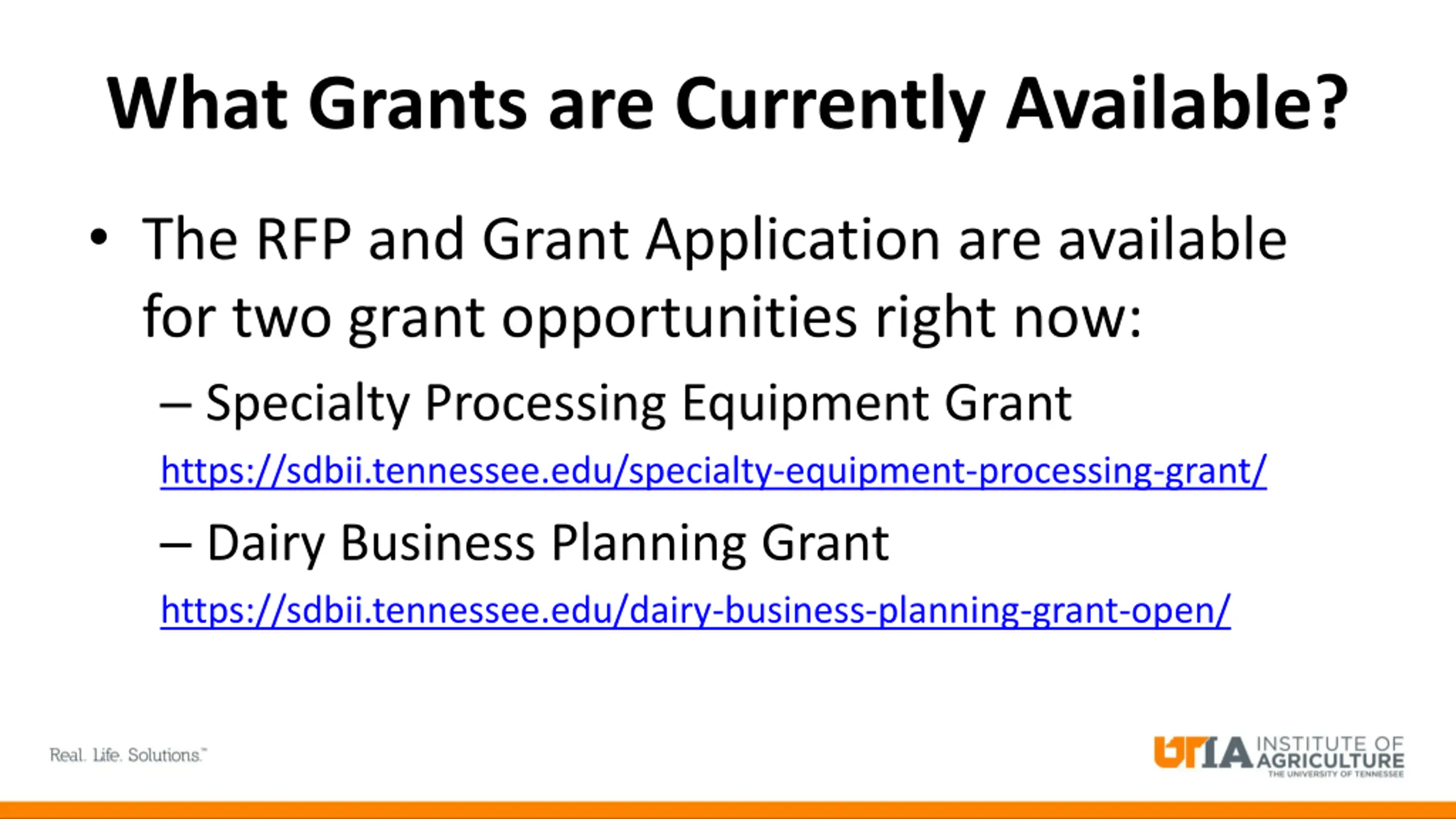 What Grants are Currently Available? The RFP and Grant Application are available for two grant opportunities right now: Specialty Processing Equipment Grant https://sdbii.tennessee.edu/specialty-equipment-processing-grant/ Dairy Business Planning Grant https://sdbii.tennessee.edu/dairy-business-planning-grant-open/