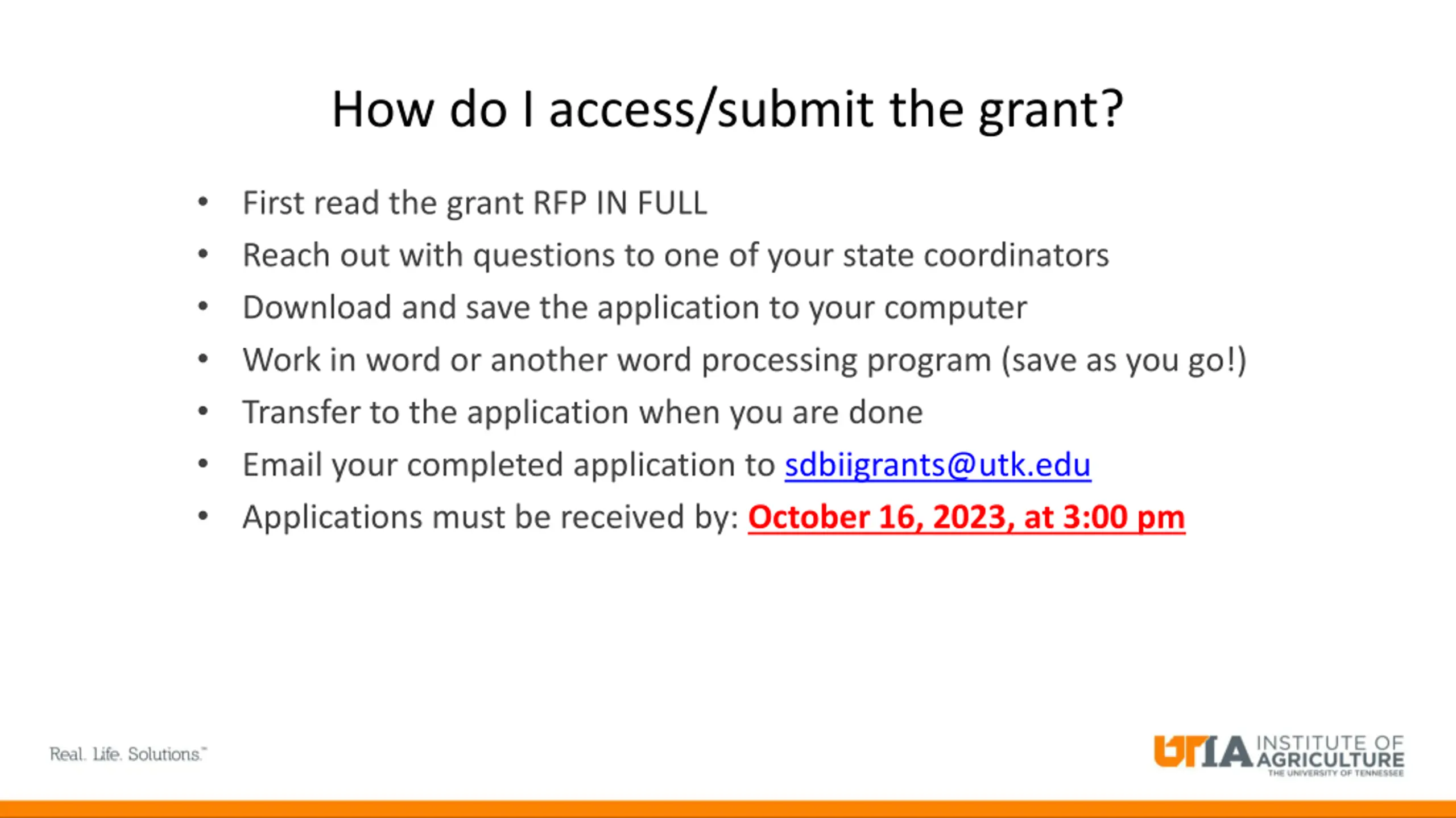 How do I access/submit the grant? First read the grant RFP IN FULL Reach out with questions to one of your state coordinators Download and save the application to your computer Work in word or another word processing program (save as you go!) Transfer to the application when you are done Email your completed application to sdbiigrants@utk.edu Applications must be received by: October 16, 2023, at 3:00 pm