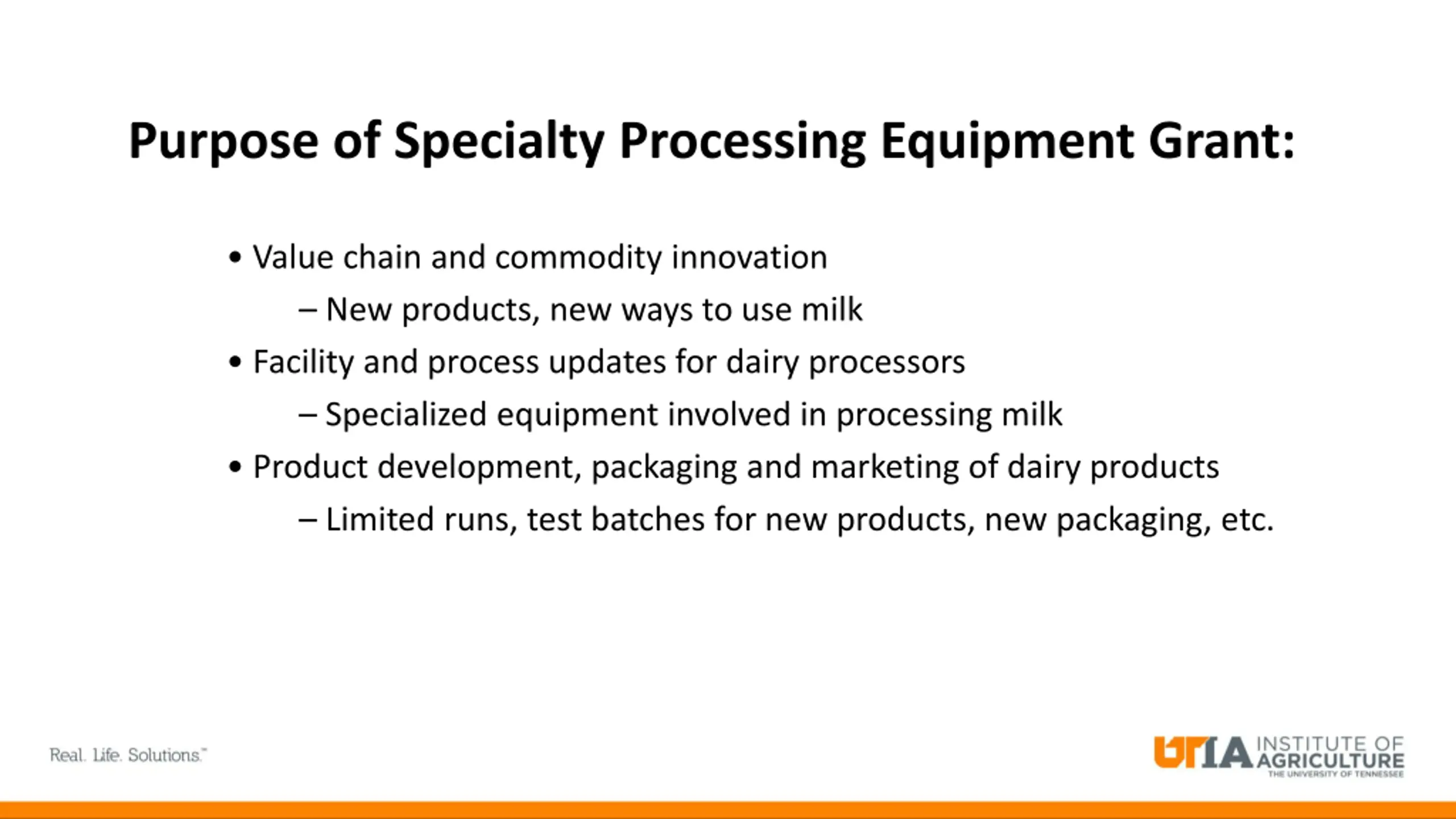 Purpose of Specialty Processing Equipment Grant: Value chain and commodity innovation New products, new ways to use milk Facility and process updates for dairy processors Specialized equipment involved in processing milk Product development, packaging and marketing of dairy products Limited runs, test batches for new products, new packaging, etc.