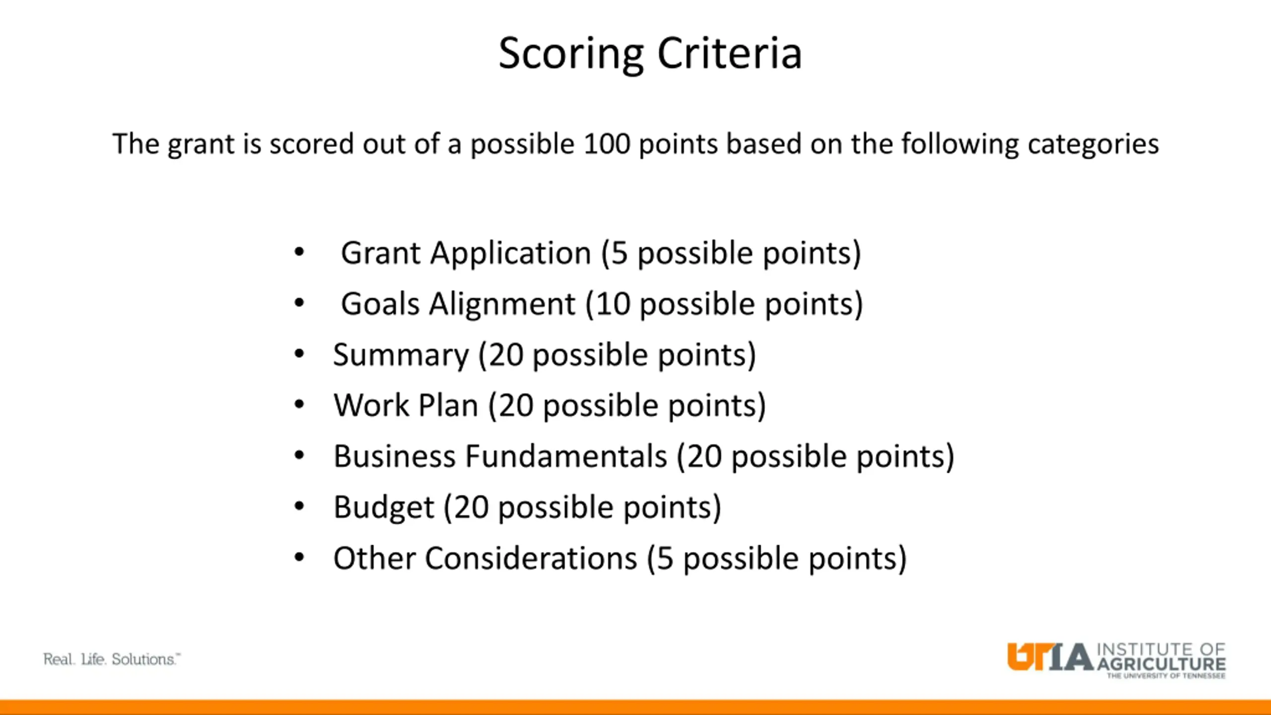 Scoring Criteria The grant is scored out of a possible 100 points based on the following categories Goals Alignment (10 possible points) Summary (20 possible points) Work Plan (20 possible points) Business Fundamentals (20 possible points) Budget (20 possible points) Other Considerations (5 possible points) Grant Application (5 possible points)