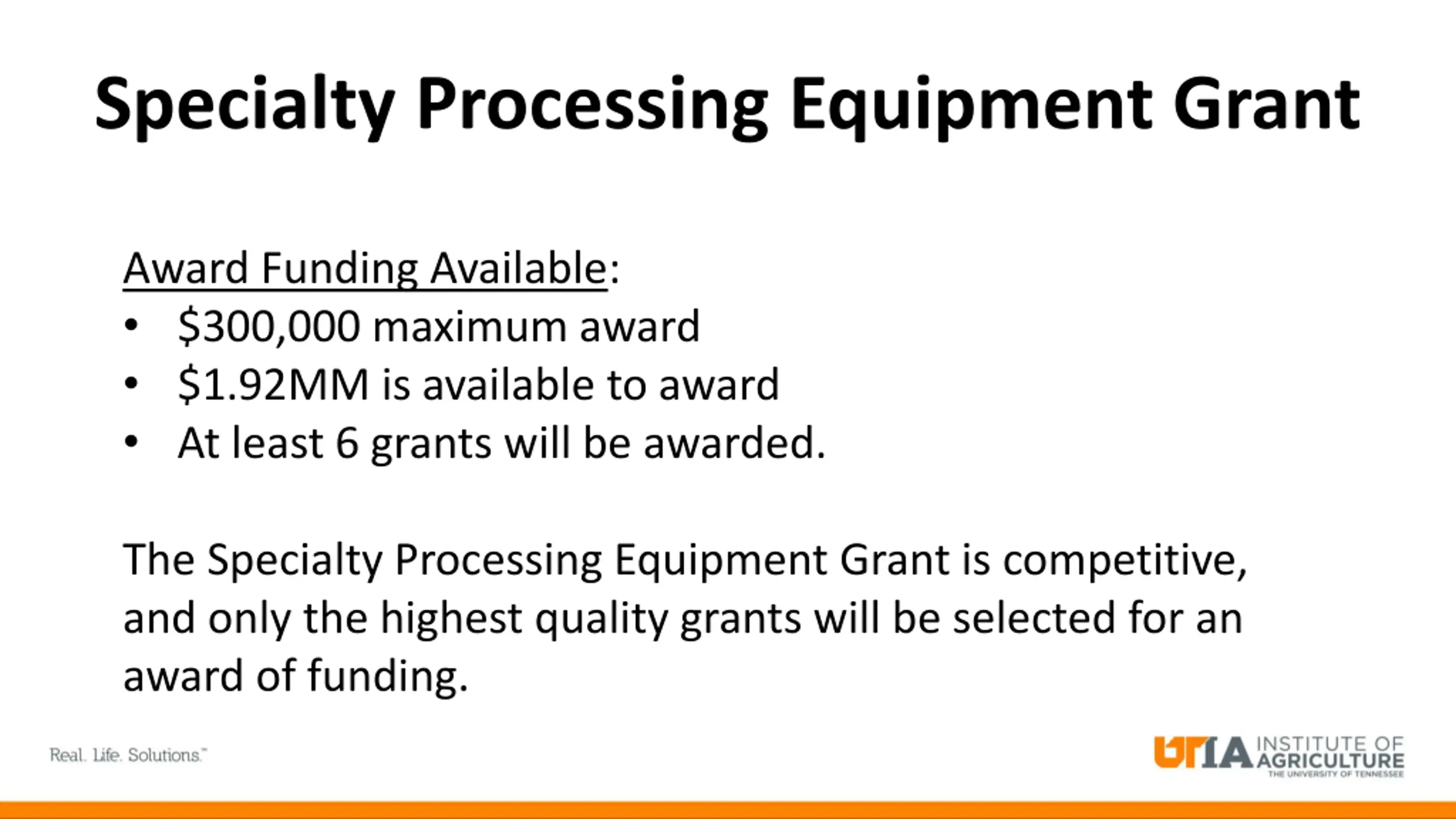 Specialty Processing Equipment Grant Award Funding Available: $300,000 maximum award $1.92MM is available to award At least 6 grants will be awarded. The Specialty Processing Equipment Grant is competitive, and only the highest quality grants will be selected for an award of funding.