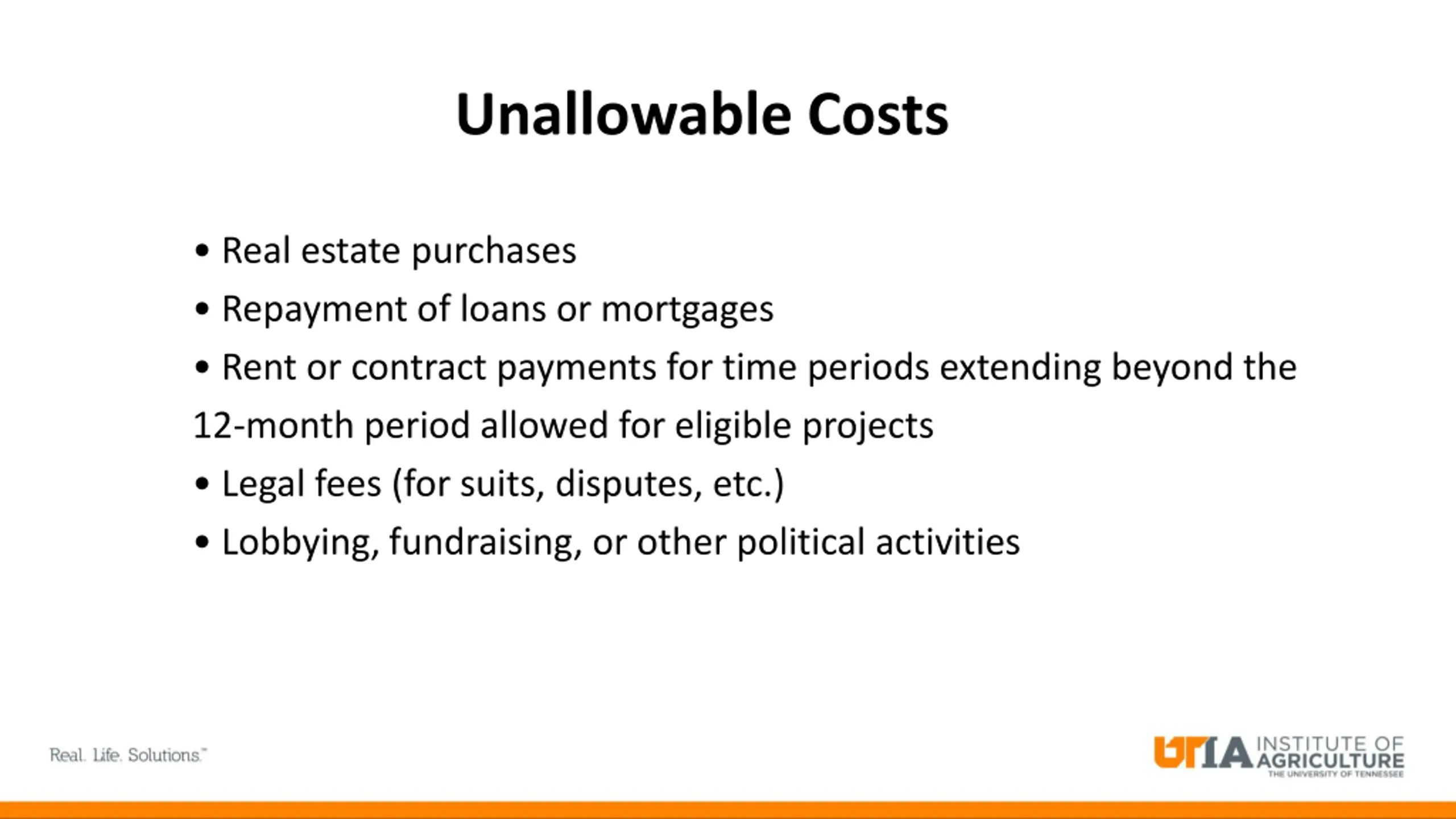 Unallowable Costs Real estate purchases Repayment of loans or mortgages Rent or contract payments for time periods extending beyond the 12-month period allowed for eligible projects Legal fees (for suits, disputes, etc.) Lobbying, fundraising, or other political activities