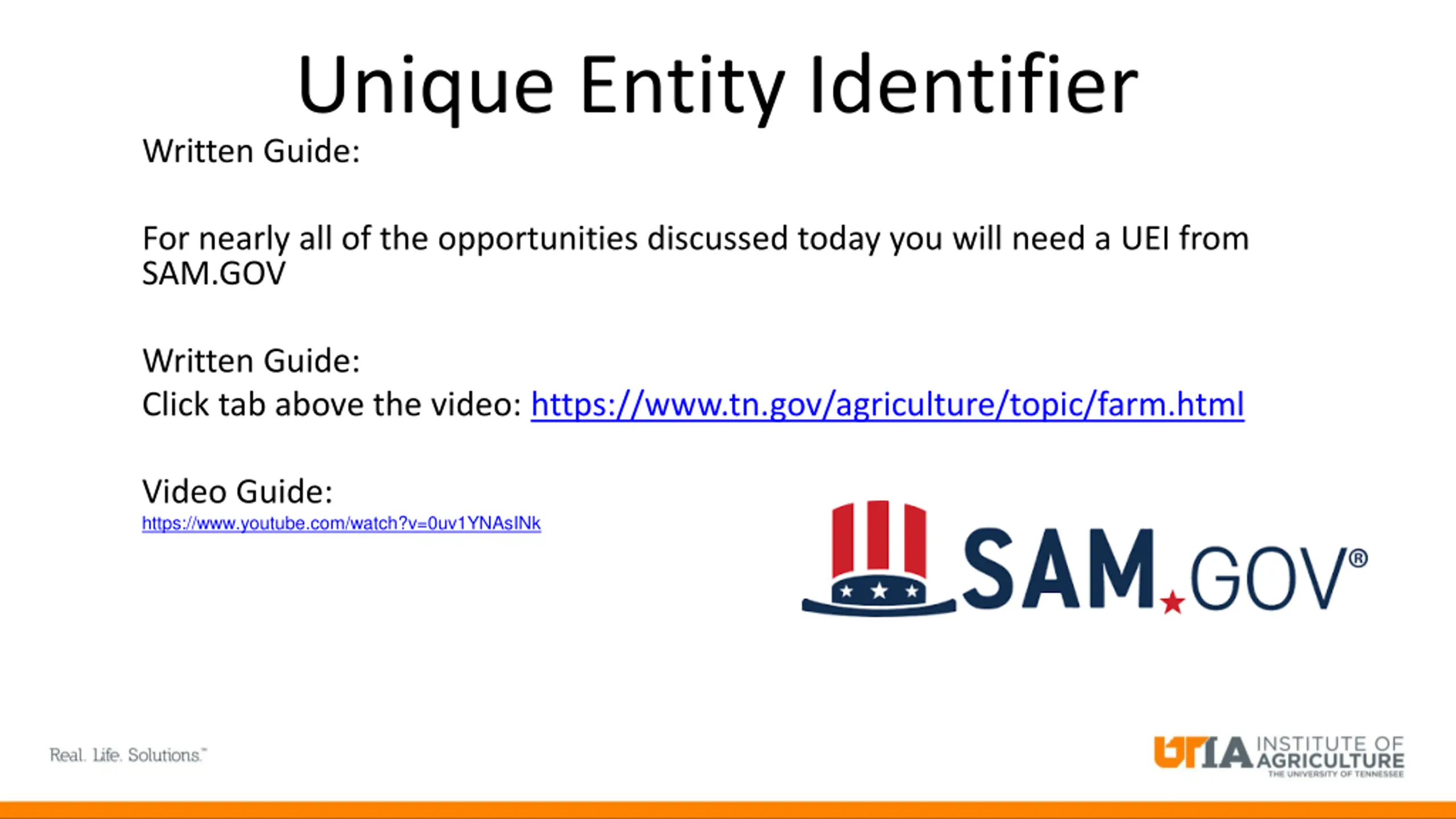 Unique Entity Identifier Written Guide: For nearly all of the opportunities discussed today you will need a UEI from SAM.GOV Written Guide: Click tab above the video: https://www.tn.gov/agriculture/topic/farm.html Video Guide: https://www.youtube.com/watch?v=0uv1YNAsINk