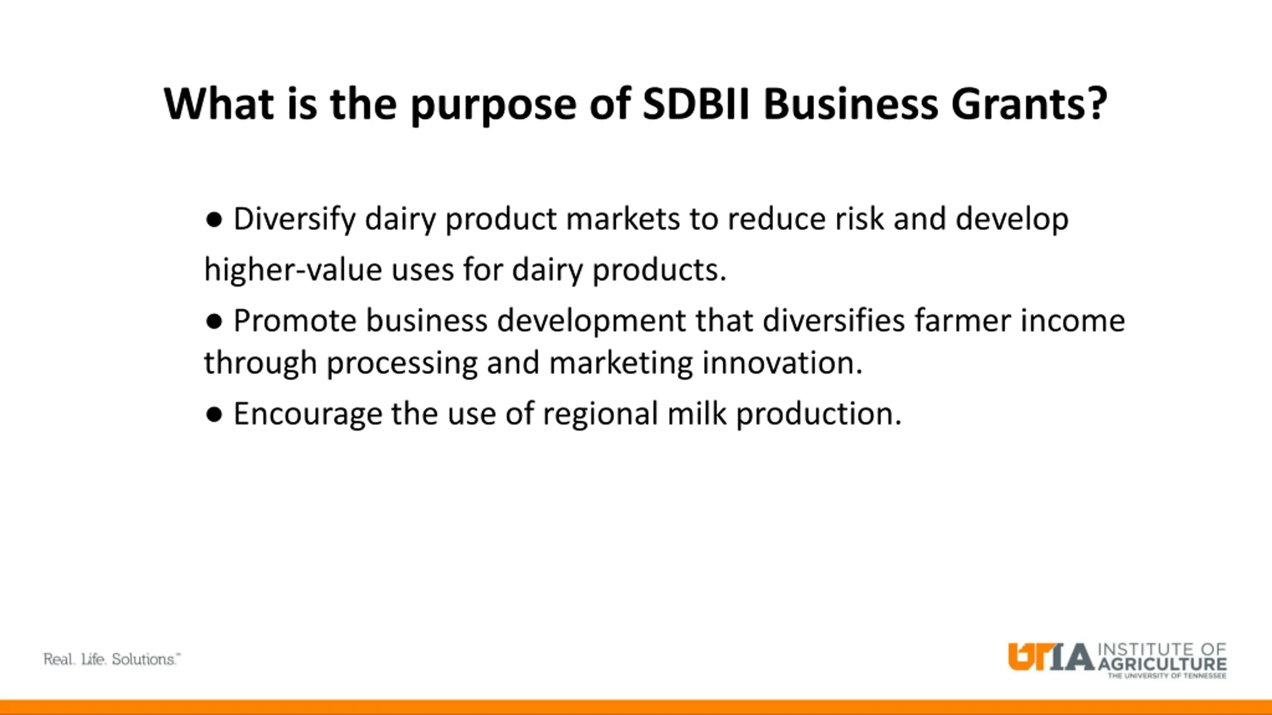 What is the purpose of SDBII Business Grants? Diversify dairy product markets to reduce risk and develop higher-value uses for dairy products. Promote business development that diversifies farmer income through processing and marketing innovation. Encourage the use of regional milk production.