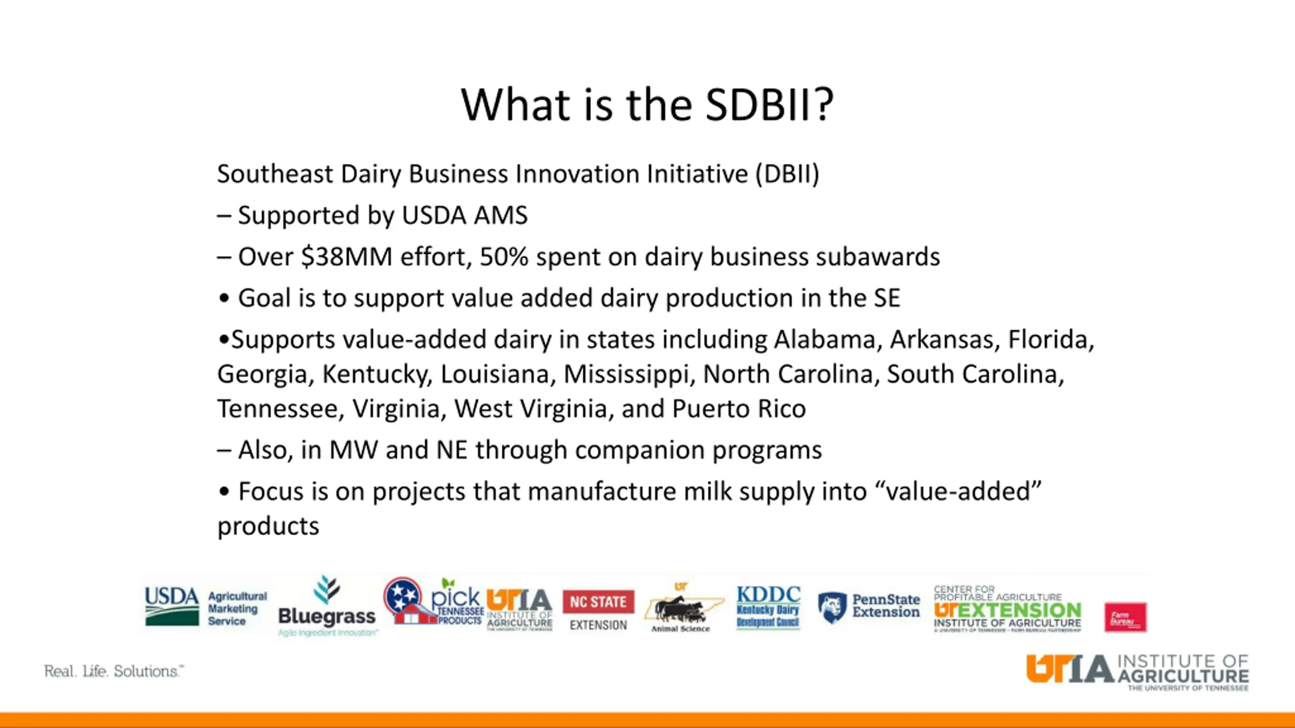 What is the SDBII? Southeast Dairy Business Innovation Initiative (DBII) Supported by USDA AMS Over $38MM effort, 50% spent on dairy business subawards Goal is to support value added dairy production in the SE Supports value-added dairy in states including Alabama, Arkansas, Florida, Georgia, Kentucky, Louisiana, Mississippi, North Carolina, South Carolina, Tennessee, Virginia, West Virginia, and Puerto Rico Also, in MW and NE through companion programs Focus is on projects that manufacture milk supply into value-added products