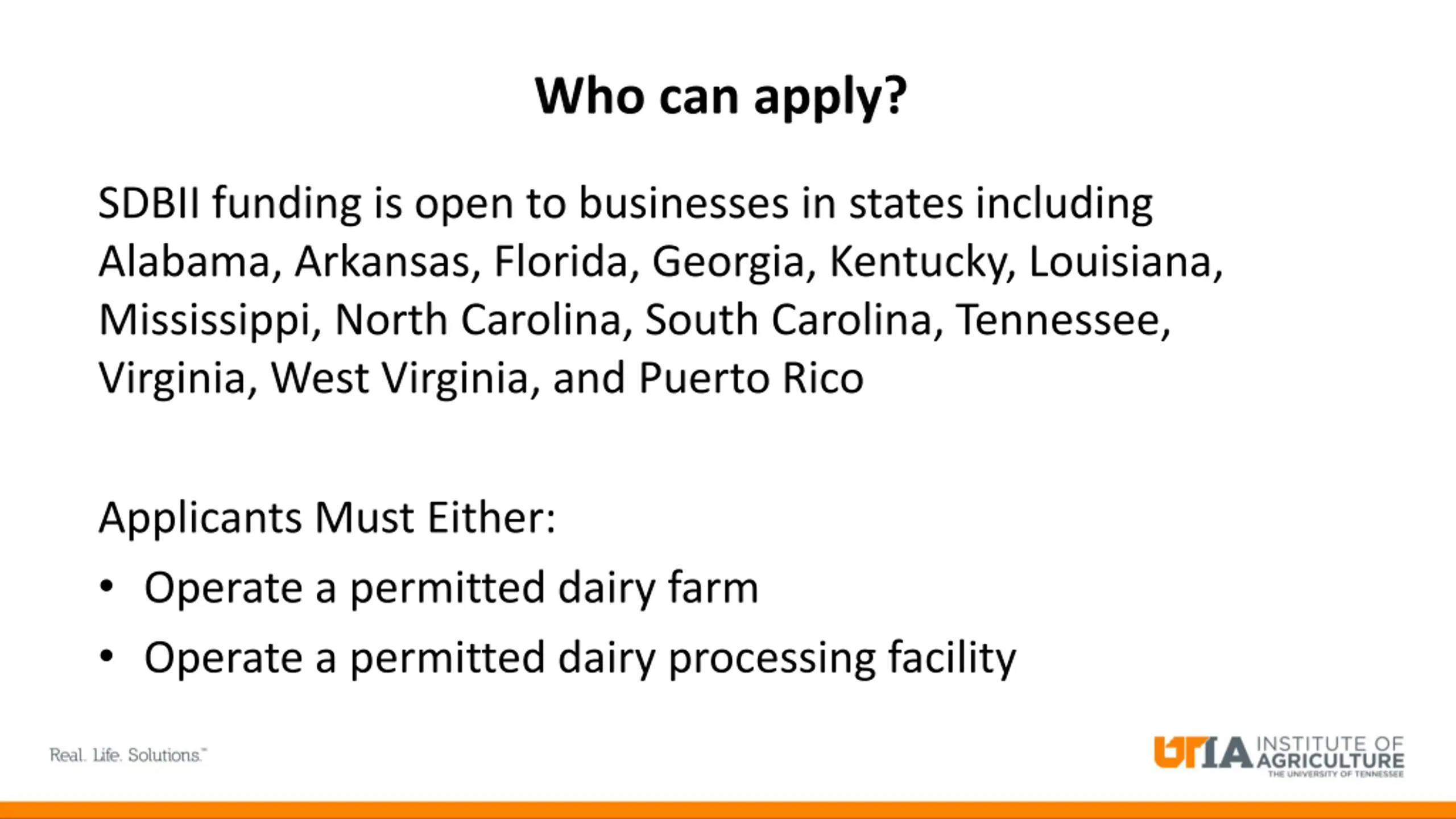 Who can apply? SDBII funding is open to businesses in states including Alabama, Arkansas, Florida, Georgia, Kentucky, Louisiana, Mississippi, North Carolina, South Carolina, Tennessee, Virginia, West Virginia, and Puerto Rico Applicants Must Either: Operate a permitted dairy farm Operate a permitted dairy processing facility