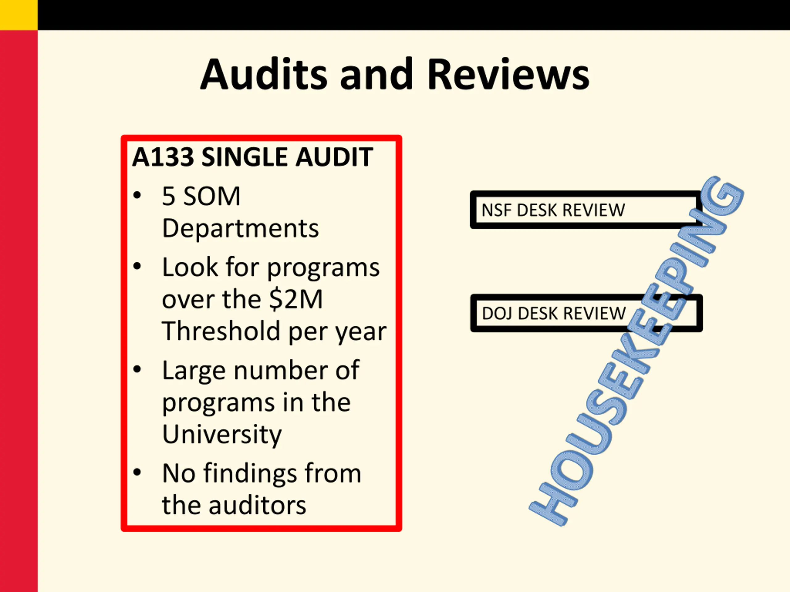 Audits and Reviews A133 SINGLE AUDIT 5 SOM Departments Look for programs over the $2M Threshold per year Large number of programs in the University No findings from the auditors NSF DESK REVIEW HOUSEKEEPING DOJ DESK REVIEW