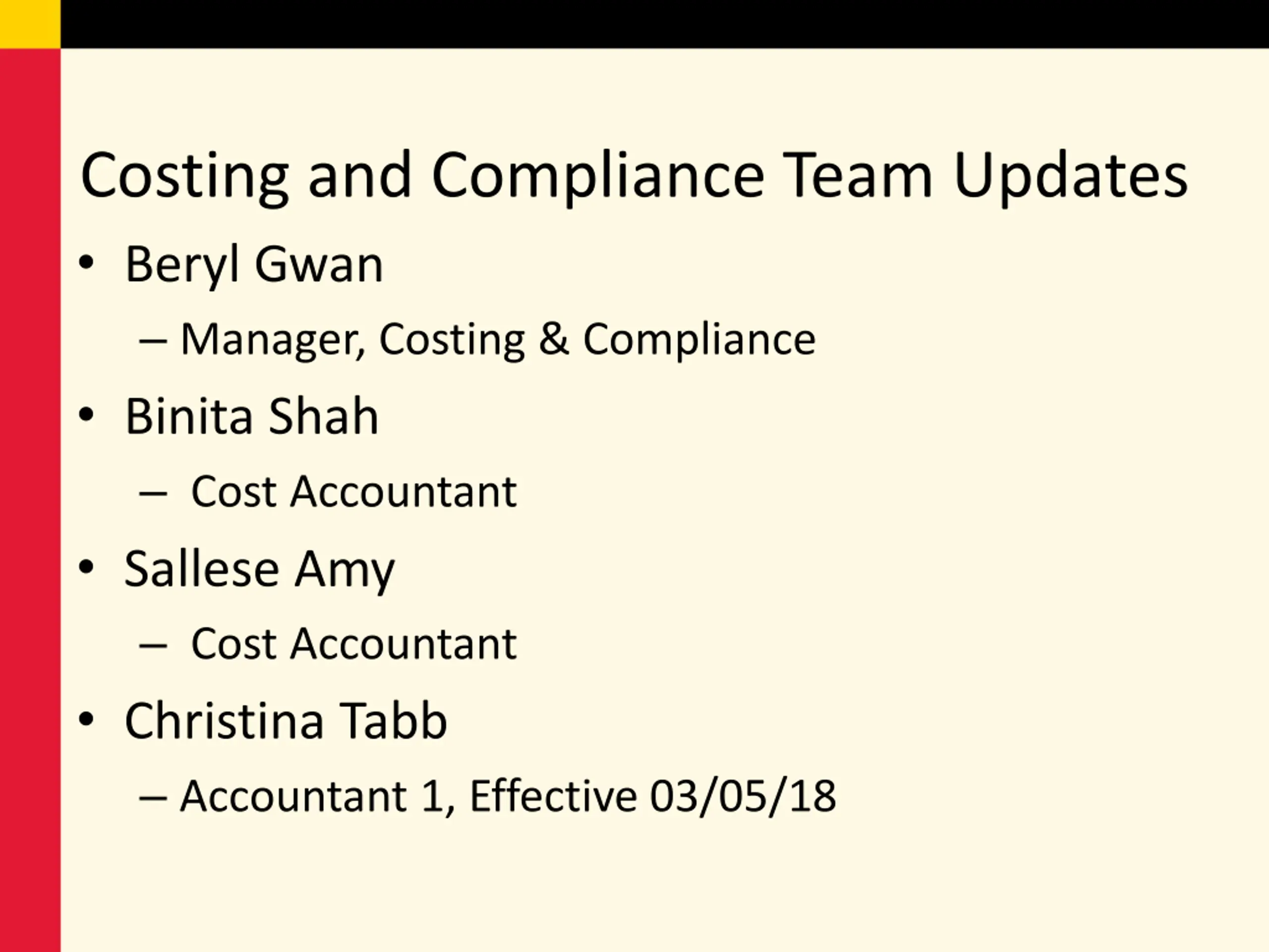 Costing and Compliance Team Updates Beryl Gwan Manager, Costing & Compliance Binita Shah Cost Accountant Sallese Amy Cost Accountant Christina Tabb Accountant 1, Effective 03/05/18